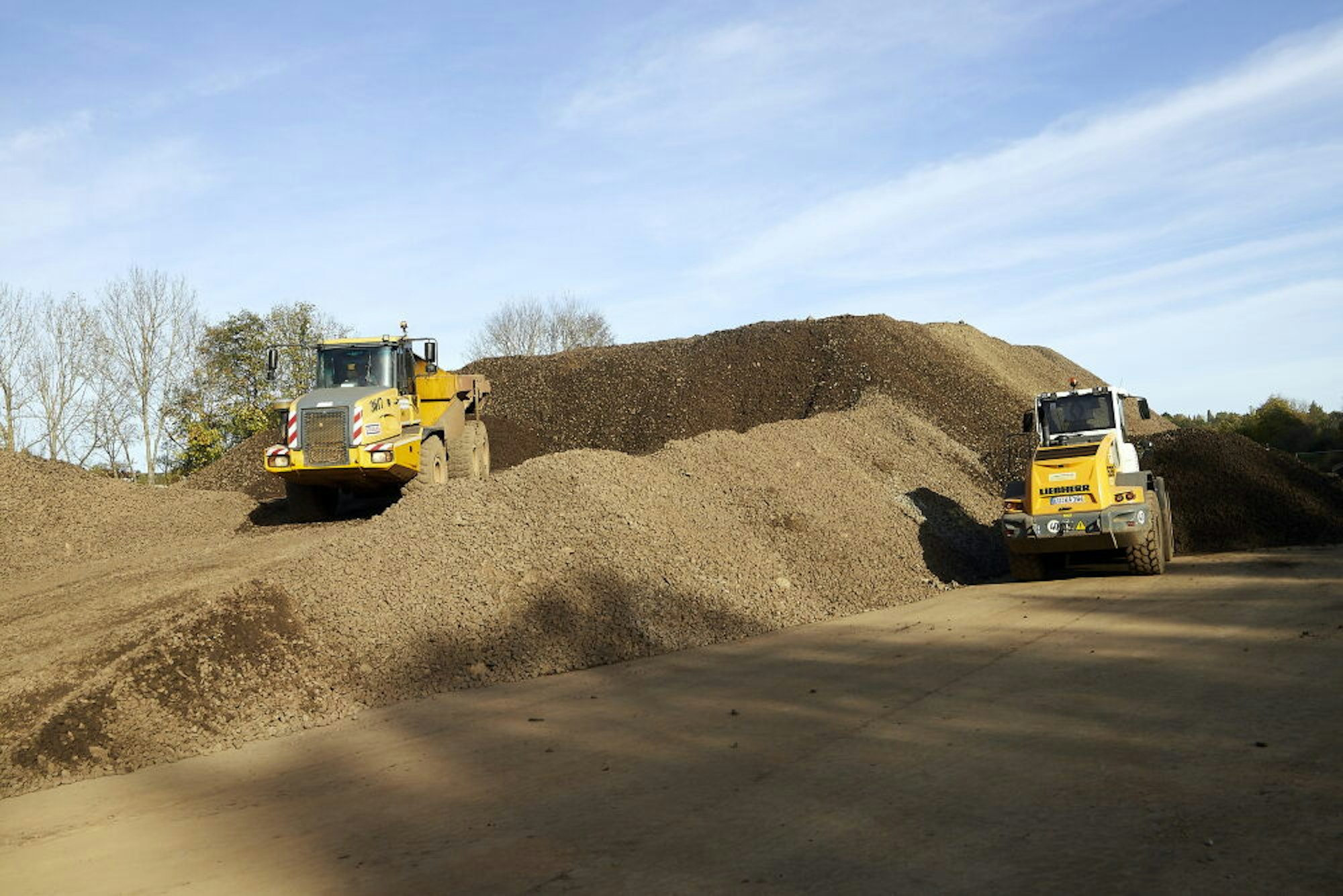 Immer wieder rollen die Lastwagen hin und her – teils über die alte Trasse, teils über die Landstraße. „Wir arbeiten an sieben Tagen die Woche – mit bis zu 20 Mitarbeitern“, sagt Bauleiter Sven Sinke von der Firma Strabag, die den Zuschlag für das Abräumen der Trasse bekommen hat. Unentwegt werden die Dumper, wie die geländegängigen Lkw genannt werden, von Baggern beladen. Sie räumen den Schotter ab, der dann auf dem Gelände des alten Kaller Sägewerkes zu großen Bergen aufschüttet wird.