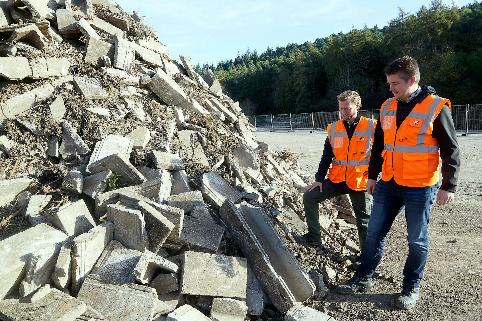 Felix Raffelsiefen und Nils Herweg sind die zuständigen Projektingenieure von der DB Netz. Ihr Bürocontainer steht ebenfalls auf dem Gelände des ehemaligen Sägewerkes. „Unsere Ingenieure haben sich schon in der Flutnacht zusammengesetzt, um über die Wiederherstellung zu beraten, obwohl noch nicht klar war, was alles kaputt ist“, berichtet Bahnsprecher Dirk Pohlmann.