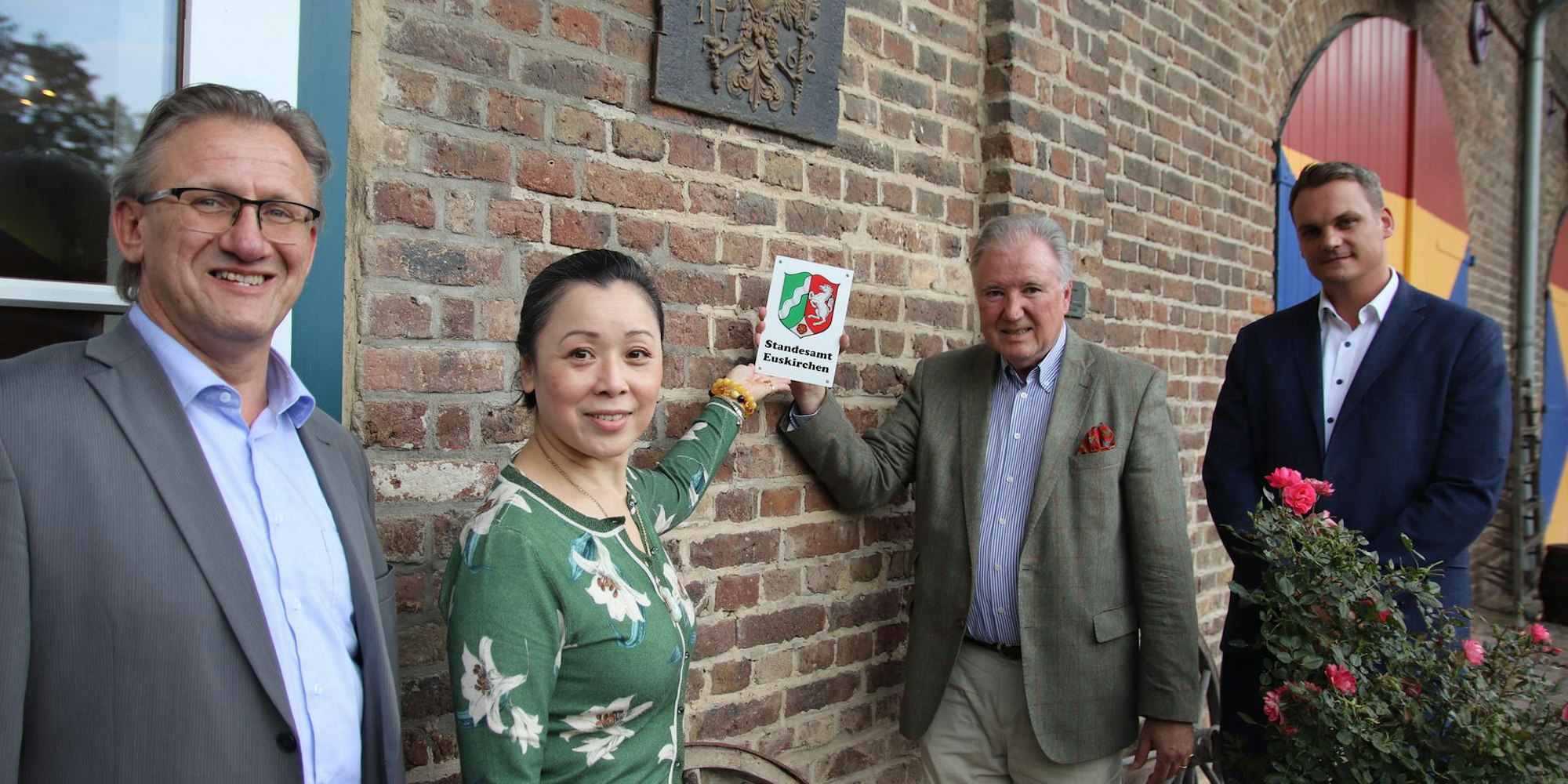 Auf der Kleeburg übergaben der Leiter des Standesamtes, Frank Michalski, und Fachbereichsleiter Jan-Christoph Neitscher jetzt das Amtsschild an den Burgherrn, Michael Freiherr von Korff, und dessen Ehefrau Cam Tu Freifrau von Korff. Das Schild weist das Trauzimmer als Außenstelle des Euskirchener Standesamts aus.