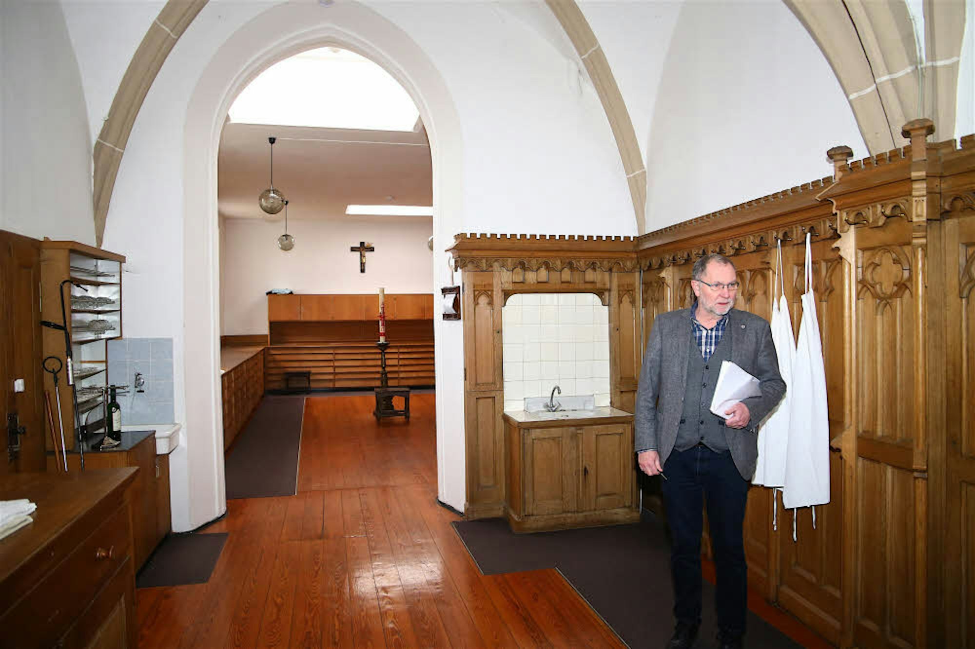 In der geräumigen Sakristei kann Wolfgang Nowak in den Schränken unter anderem die Messgewänder der Patres zeigen.