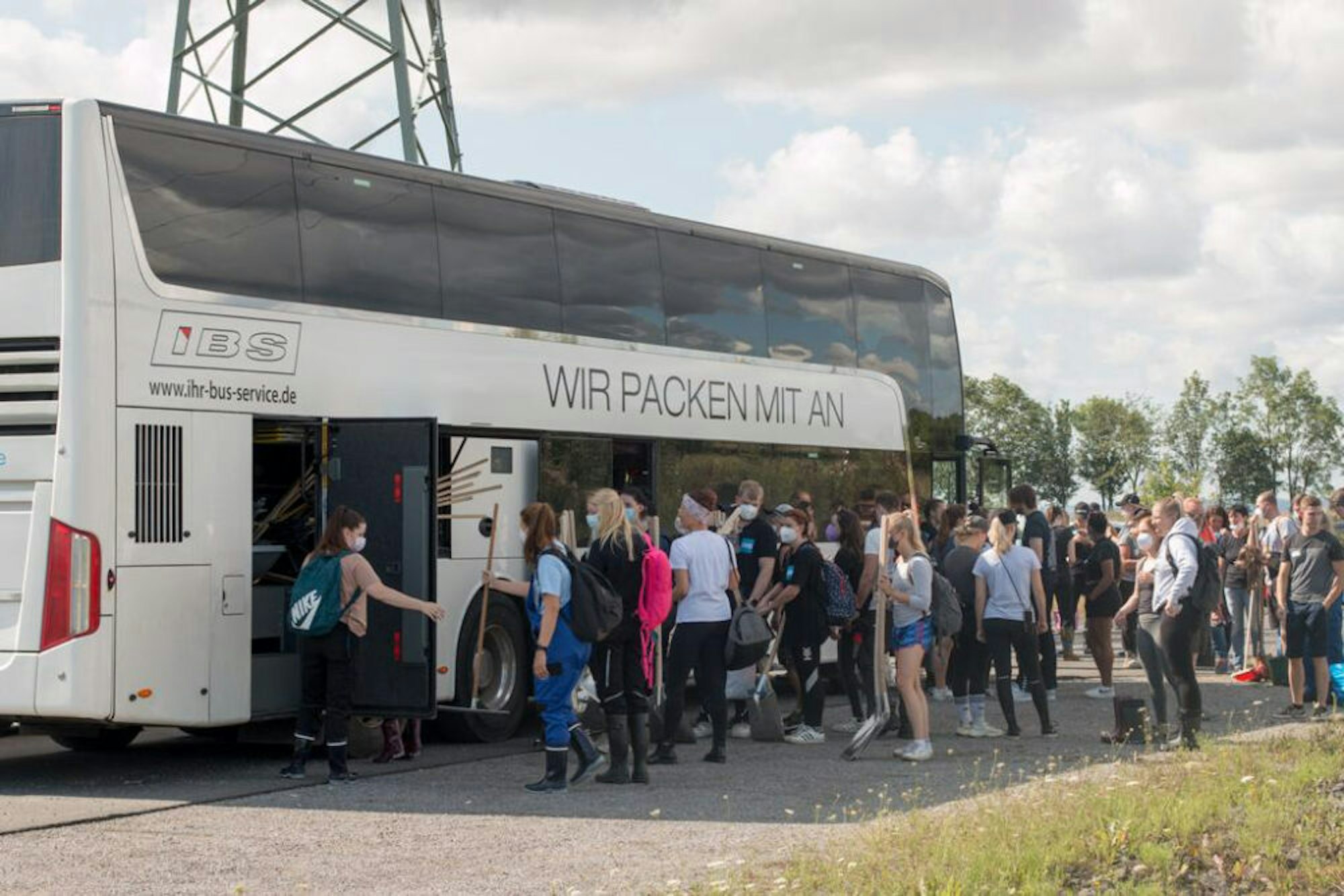 Mit Reisebussen wurden die Helfer in die Flutgebiete gebracht.