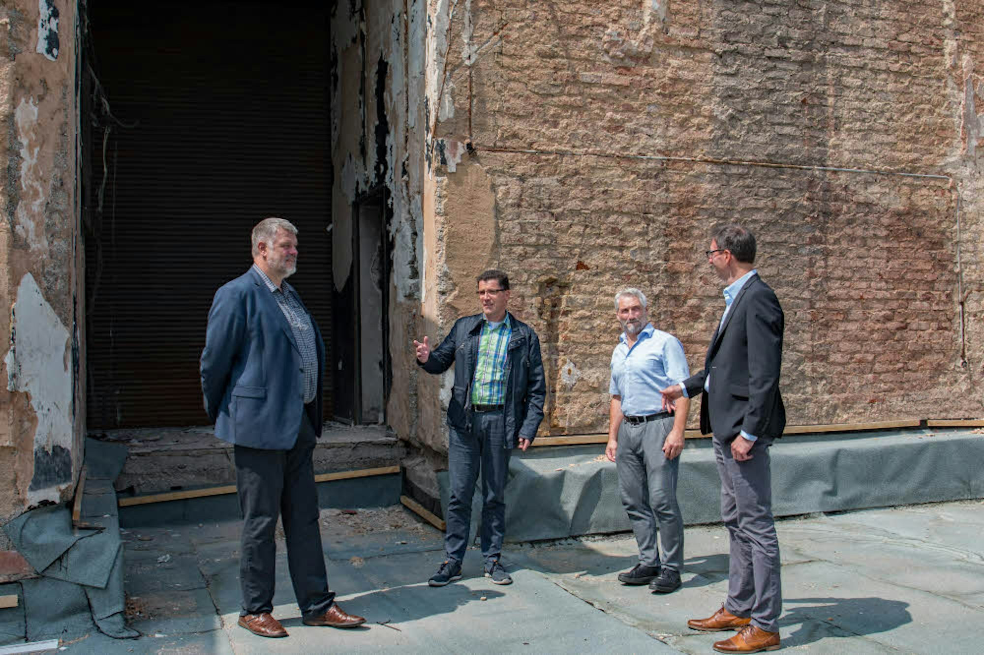 Nach den Aufräumarbeiten im Sturmius-Gymnasium freuen sich Schulleiter Georg Jöbkes (v.l.) sowie Armin Fischbach, Harry Dietrich und Marcel Wolter von der Schleidener Verwaltung auf den Wiederauf- und Neubau.