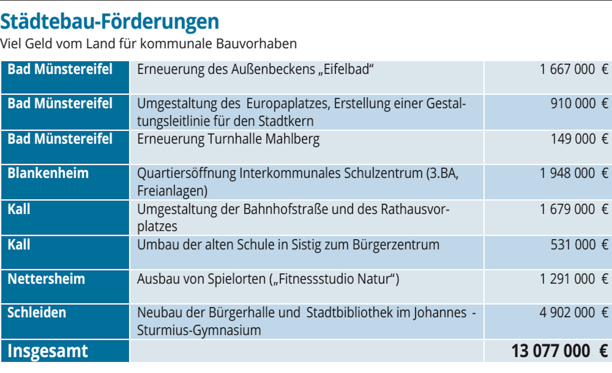 - Mehr als 600 Millionen Euro waren landesweit an Förderungen für den Städtebau zu vergeben, knapp über 13 Millionen davon gehen in den Kreis Euskirchen.