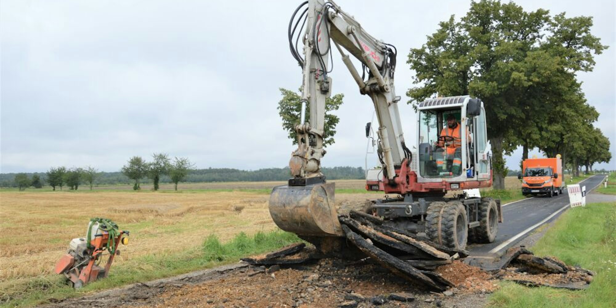 Mit einem Bagger wird die alte Asphaltdecke auf Lastwagen verladen und abtransportiert.