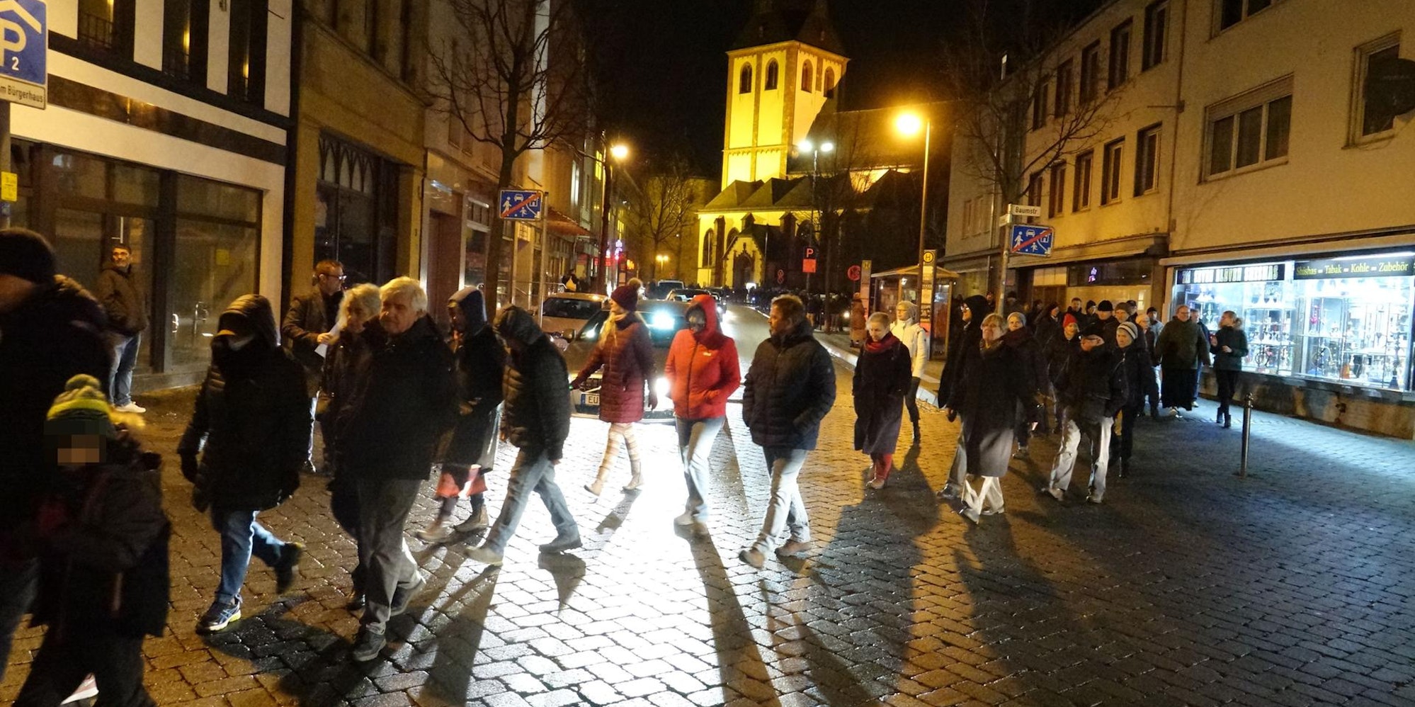 1300 Menschen haben sich am Montagabend laut Polizeiangaben ohne Anmeldung in der Gummersbacher Innenstadt versammelt und gegen eine Impfpflicht demonstriert. Dis bisherige Veranstalterin hatte ihre Anmeldung am Sonntag per Mail zurückgezogen, weil sie laut Polizei nicht die erforderliche Zahl von Ordnern zusammenbekommen habe. Eine als „Spaziergang“ deklarierte Versammlung war die Folge. Zu Beginn sind mehr als 75 Prozent der Teilnehmer ohne Maske durch die Stadt gezogen. Später, nachdem das Gummersbacher Ordnungsamt per Lautsprecher-Durchsage mehrfach auf eine Maskenpflicht und drohende Bußgelder hingewiesen hat, ist die Zahl der Maskenträger auf etwa 50 Prozent gestiegen.