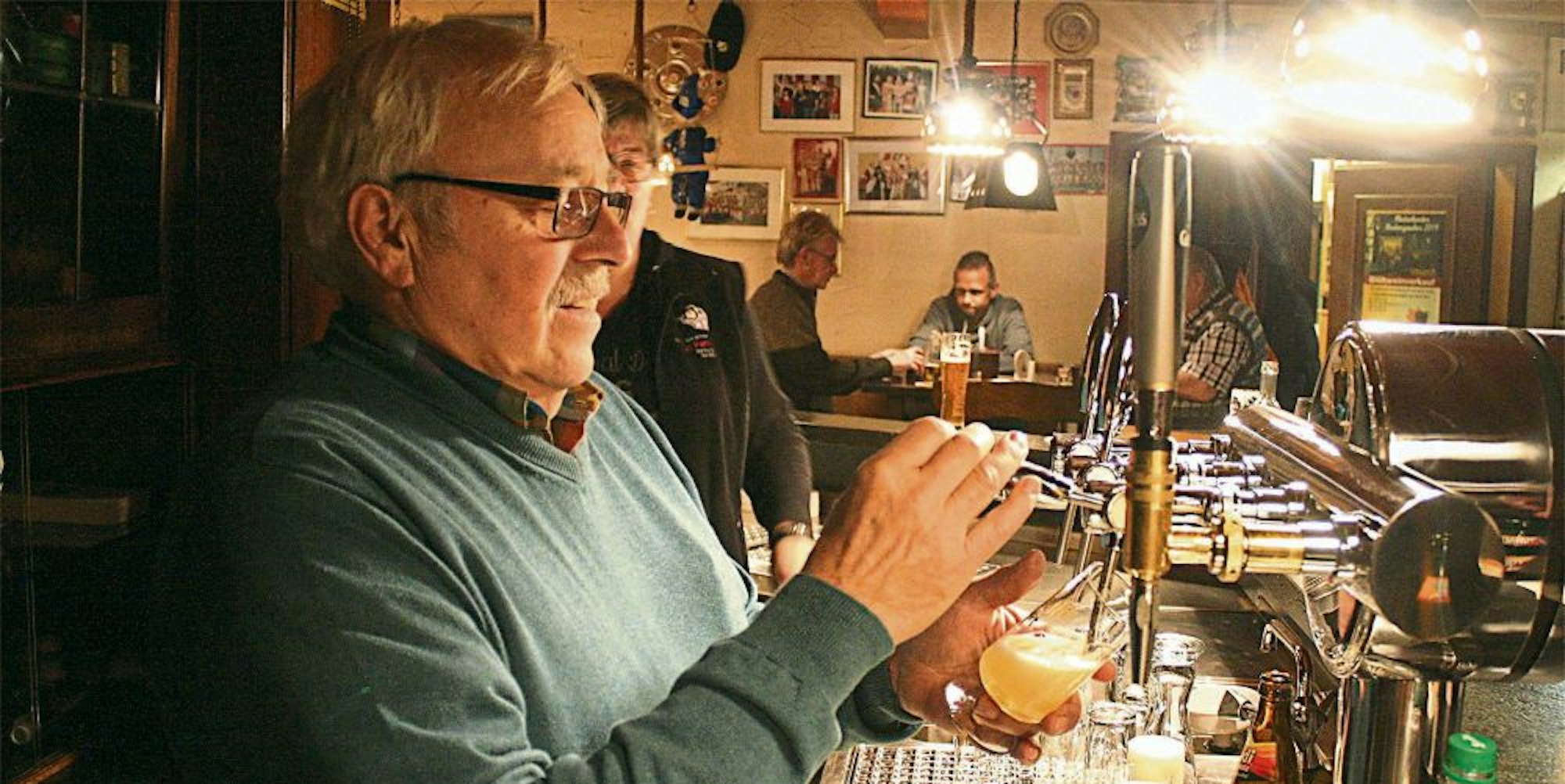 Den Thekenklaaf zum Feierabendbier pflegt Manfred Prinz, der seit 1980 Inhaber des Gasthauses Prinz in Mutscheid ist. Eine Küche würde zu seiner Kneipe nicht passen.