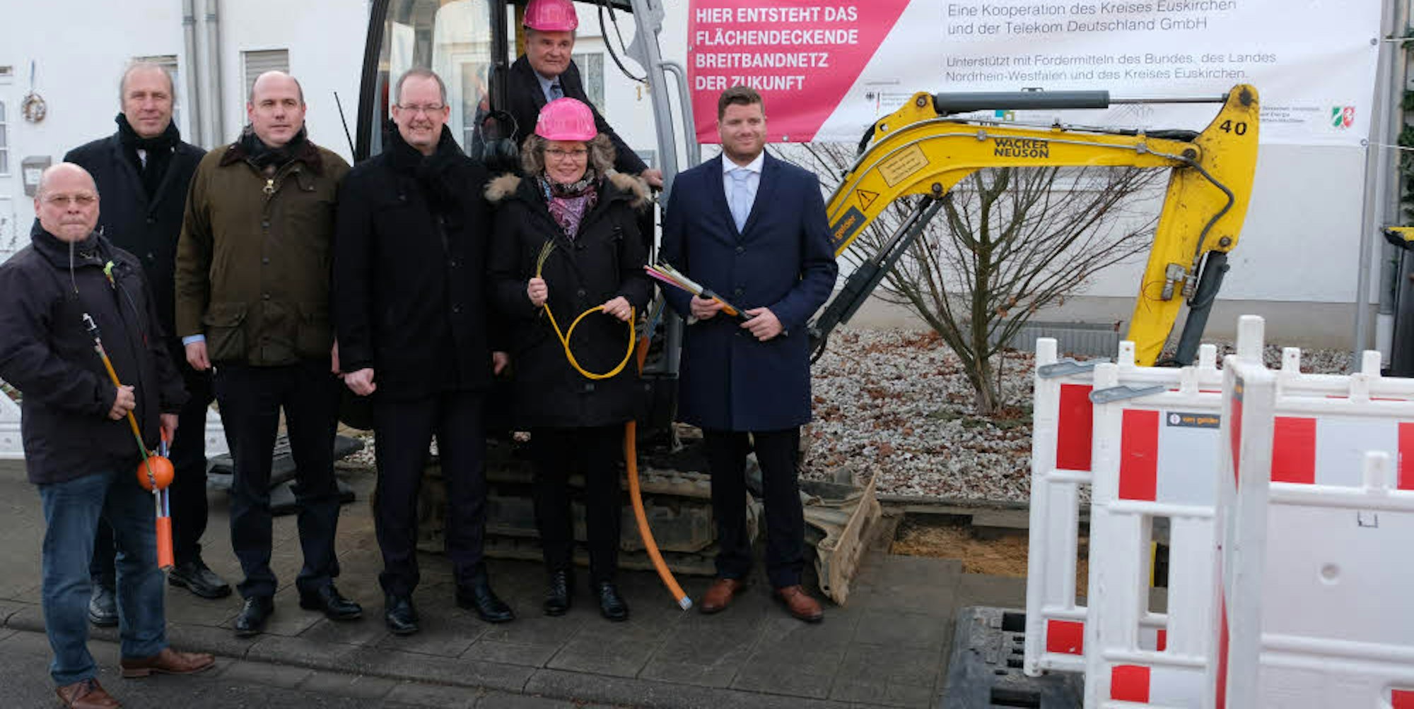 Kreis Euskirchen – Ein Minibagger, eine kleine Baugrube, ein Häufchen Sand und drei Spaten, darum gruppierte sich eine Gruppe Menschen: Mit einem symbolischen Spatenstich wurde am Dienstagnachmittag in der Bachstraße in Weilerswist der flächendeckende Ausbau des Breitbandnetzes im Kreis Euskirchen gestartet. In zwei Jahren, so habe man es ihm versprochen, sei jeder Haushalt im Kreis Euskirchen mit schnellem Internet versorgt, erklärte Landrat Günter Rosenke.