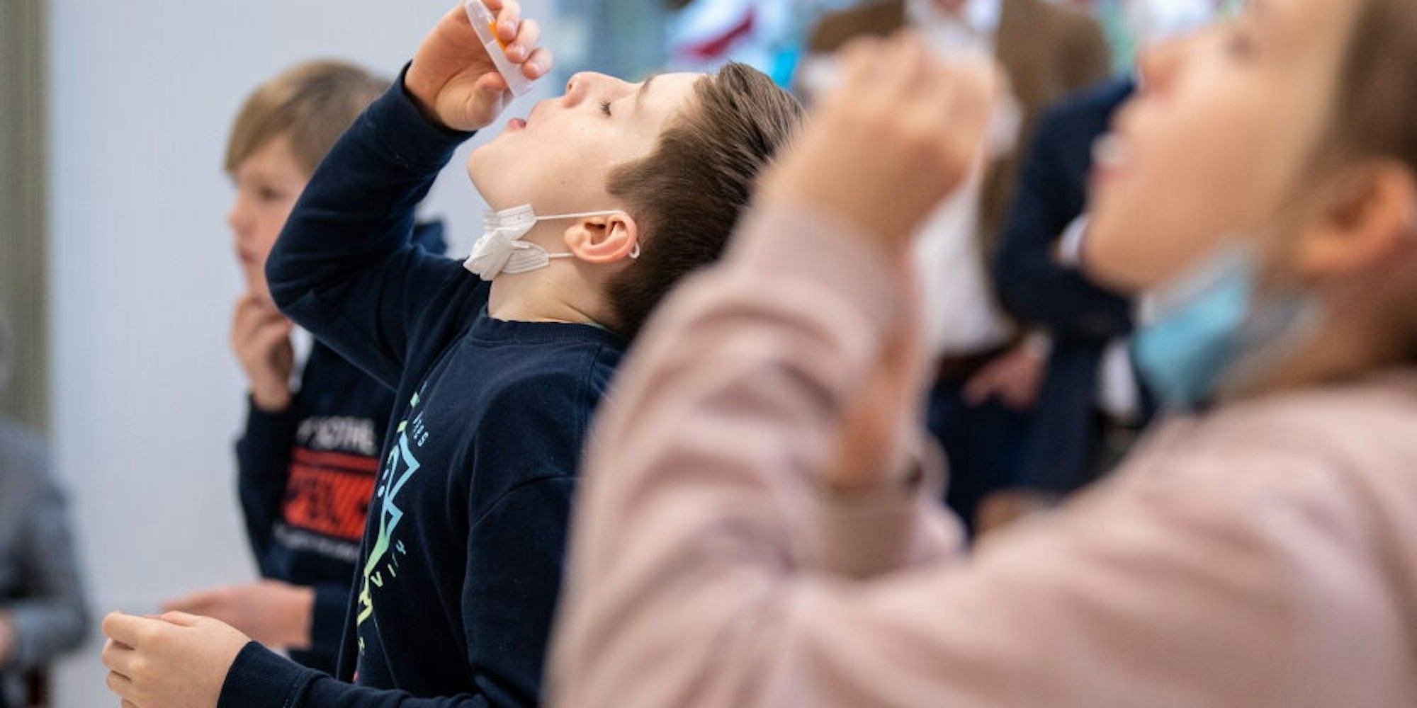 Während des Unterrichts lassen sich Schüler zwecks Coronatest ein Watteröhrchen in den Mund fallen, das den Speichel aufsaugt. Selbsttests in den Schulen sollen ab nächster Woche in NRW möglich sein. (Symbolbild)
