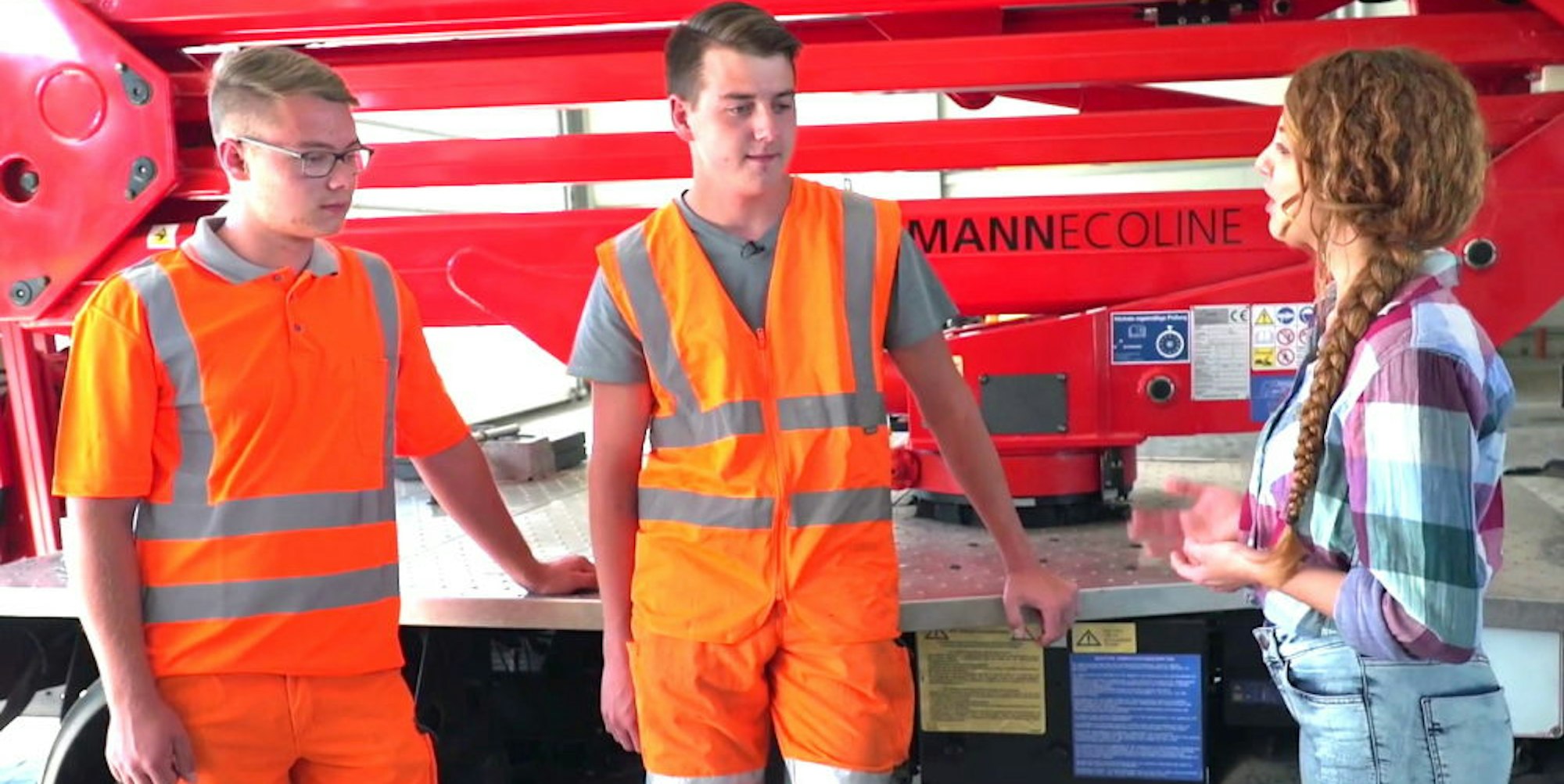 Hat Spaß gemacht: Sven Kolvenbach (l.) und Alexander Schmitz mit „YourStart“-Reporterin Lisa bei den Dreharbeiten auf dem Kreisbauhof. Mit dem Film soll für eine Ausbildung beim Kreis geworben werden.