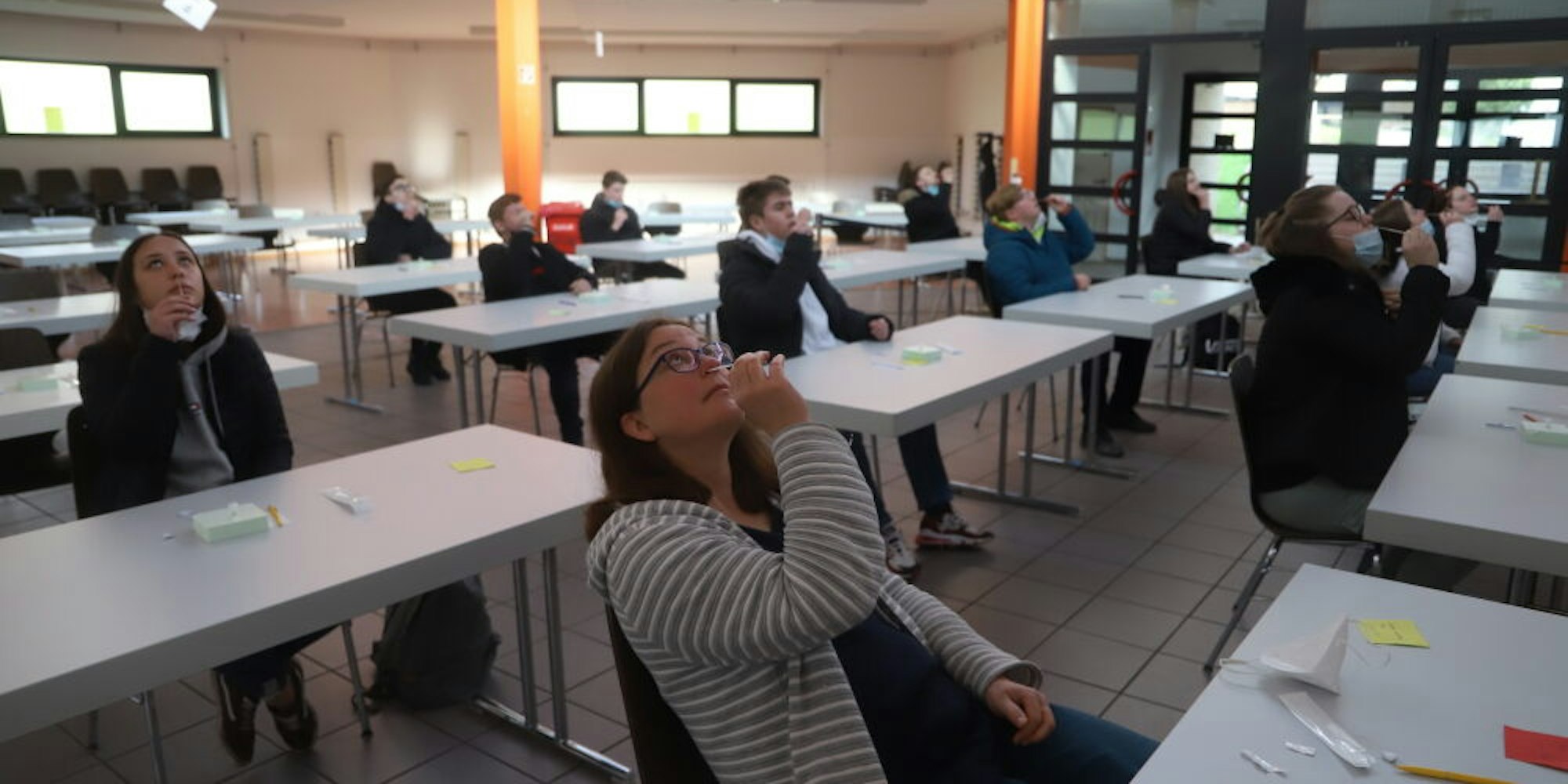 Kopf in den Nacken, Stäbchen in die Nase: Die Schüler in der Mechernicher Gesamtschule führen ihre Corona-Selbsttests durch. Von Montag bis Donnerstag werden in der Schule die Tests angeboten.