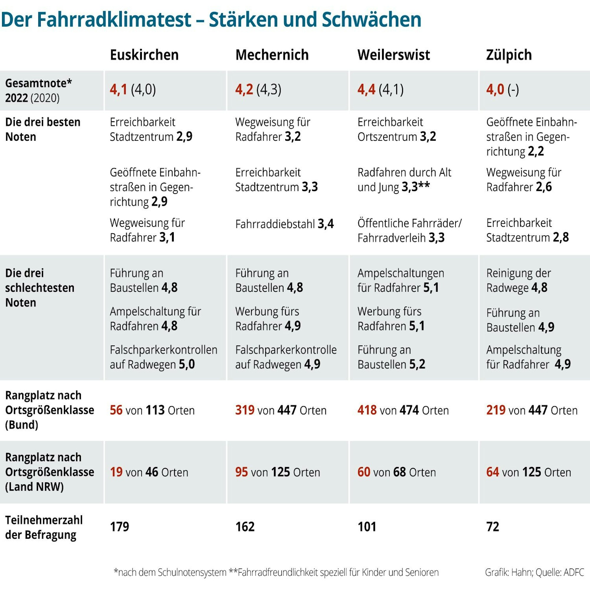 Vier Kommunen im Kreis schafften es laut ADFC in die Bewertung, weil dort ausreichend Bürger an der Befragung teilgenommen hätten, um die Situation der Radler einschätzen zu können. „Obwohl die Stadt Euskirchen seit 28 Jahren und der Kreis seit 21 Jahren Mitglied in der Arbeitsgemeinschaft fußgänger- und fahrradfreundlicher Städte, Gemeinden und Kreise in NRW sind, kommen Euskirchen, Mechernich, Zülpich und Weilerswist im neuen Fahrradklimatest des ADFC nicht über die Schulnote 4 hinaus“, stellt der ADFC fest.