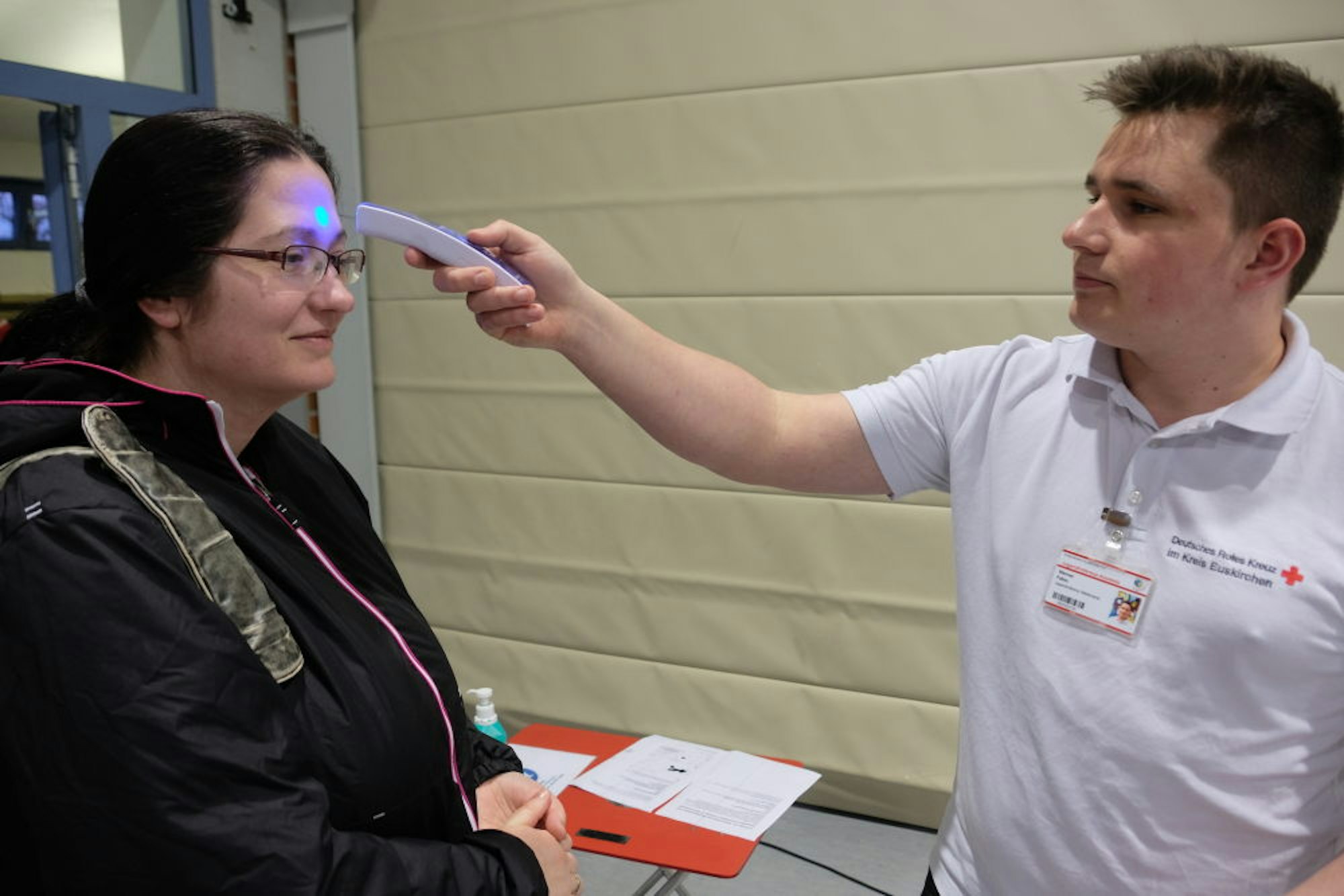 „Schön, dass Sie zu uns gekommen sind“, werden die Besucher in der Turnhalle von Fabio Werner vom Jugendrotkreuz freundlich begrüßt: „Ich messe erst einmal Ihre Körpertemperatur, wenn Sie sich vorher bitte die Hände hier gründlich desinfiziert haben.“ Werner nimmt ein Fieberthermometer und richtet es auf die Stirn des Neuankömmlings, in diesem Fall eine junge Frau. Ein blaues Licht erscheint auf der Stirn, dann ist die „Fiebermessung“ schon vorbei, kontaktlos und aus sicherer Distanz.