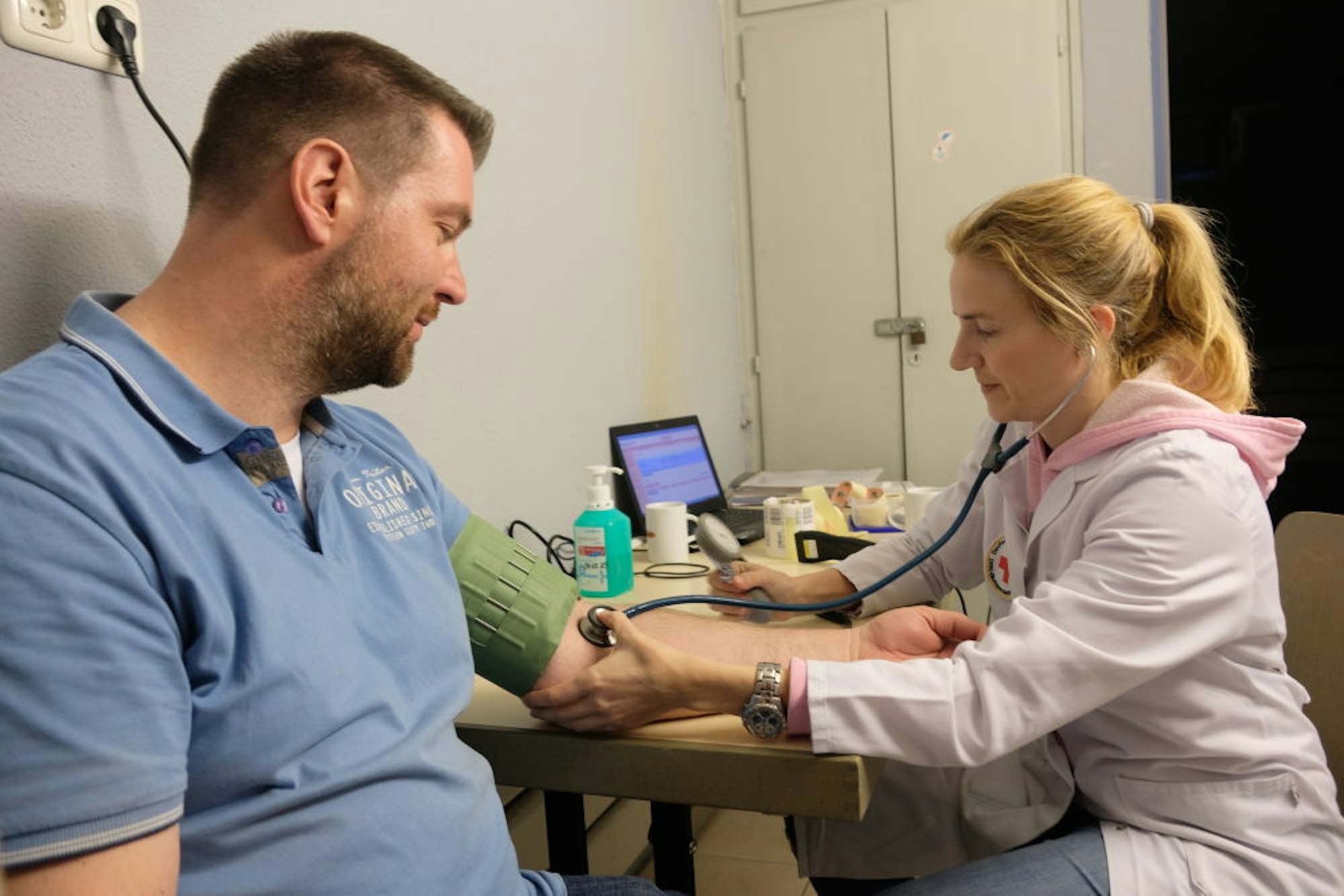 Erfahrener Spender: Marko Farken lässt sich von Ärztin Nadine Kremer nach dem Anamnese-Gespräch den Blutdruck messen .