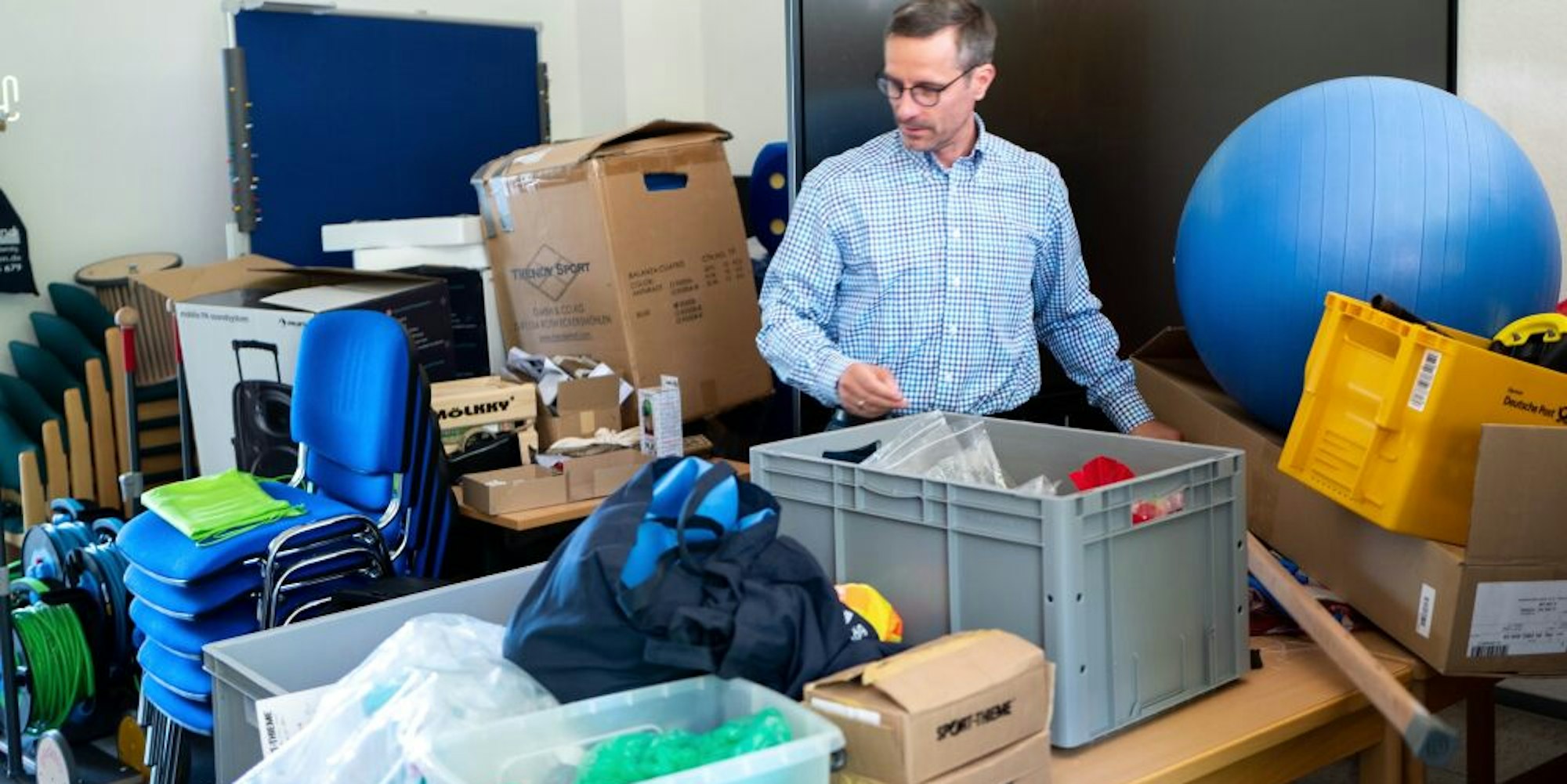 Das Materiallager des Kreissportbunds, in dem Markus Strauch steht, ist schon wieder gut gefüllt.