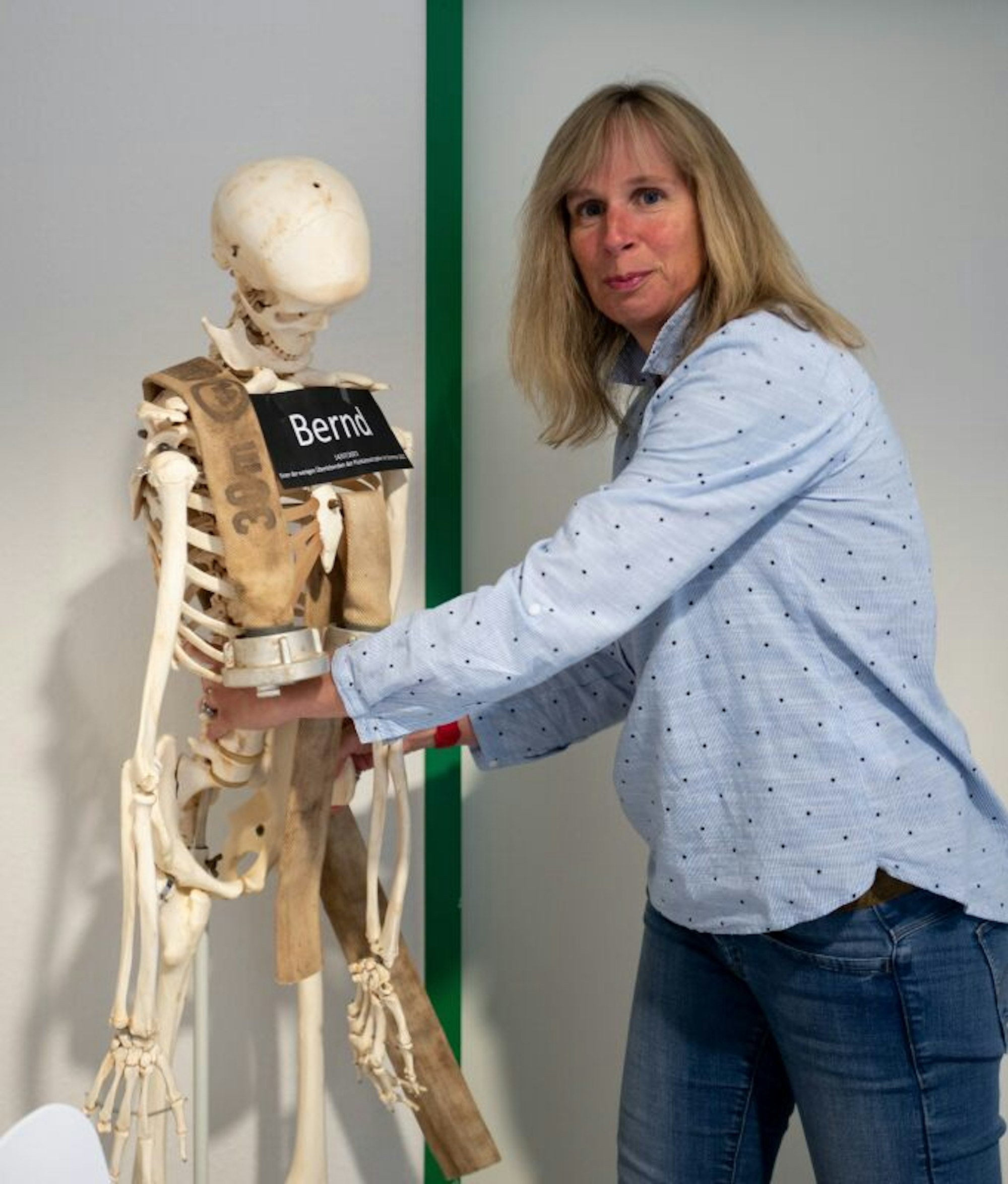 47.000 Euro – so hoch war laut dem Geschäftsführer der Sachschaden, den die Flut angerichtet hat. Vornehmlich seien Materialien zerstört worden. Nur weniges habe man retten können. Dazu gehört Bernd. Bernd ist ein Lehrskelett, das nun als Mahnmal an den 14. Juli 2021 verschlammt mit einem Feuerwehrschlauch um den knochigen Hals vor dem Büro des Geschäftsführers steht. Zudem steht in jedem Büro ein Stück Wand von den Materialräumen samt KSB-Logo. „Das meiste Material ist wieder neu angeschafft“, berichtet Strauch.