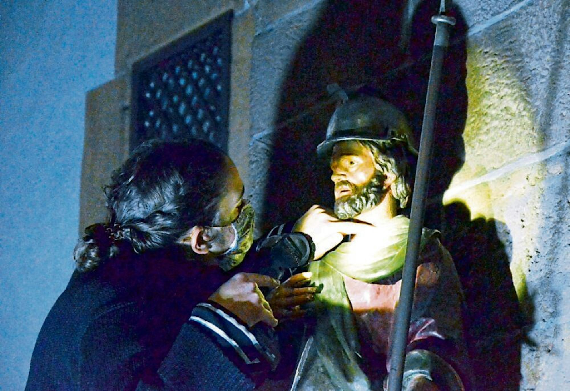 Im Schein einer Lampe untersucht Sarah Renn in der Martinskirche von einer Leiter aus die Statue des heiligen Donatus.