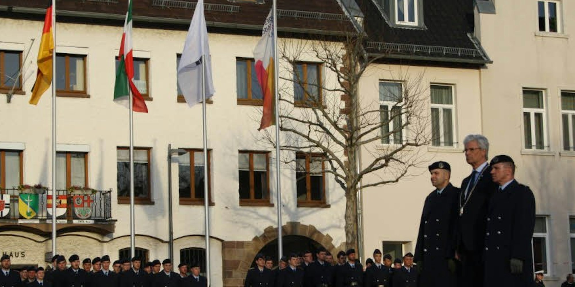 Zülpich – Zum Verabschiedungsappell marschierten über 200 Soldaten des zweiten Objektschutzregiments der Luftwaffe aus Kerpen zum letzten Mal auf dem Zülpicher Marktplatz. Im Rahmen der Neuausrichtung der Bundeswehr wird das Objektschutzregiment aus dem Rhein-Erft-Kreis zum 31. März aufgelöst. Damit endet auch die Patenschaft der Stadt Zülpich über das Regiment, die den Einsatzkräften mit einem feierlichen Appell Adieu sagte.