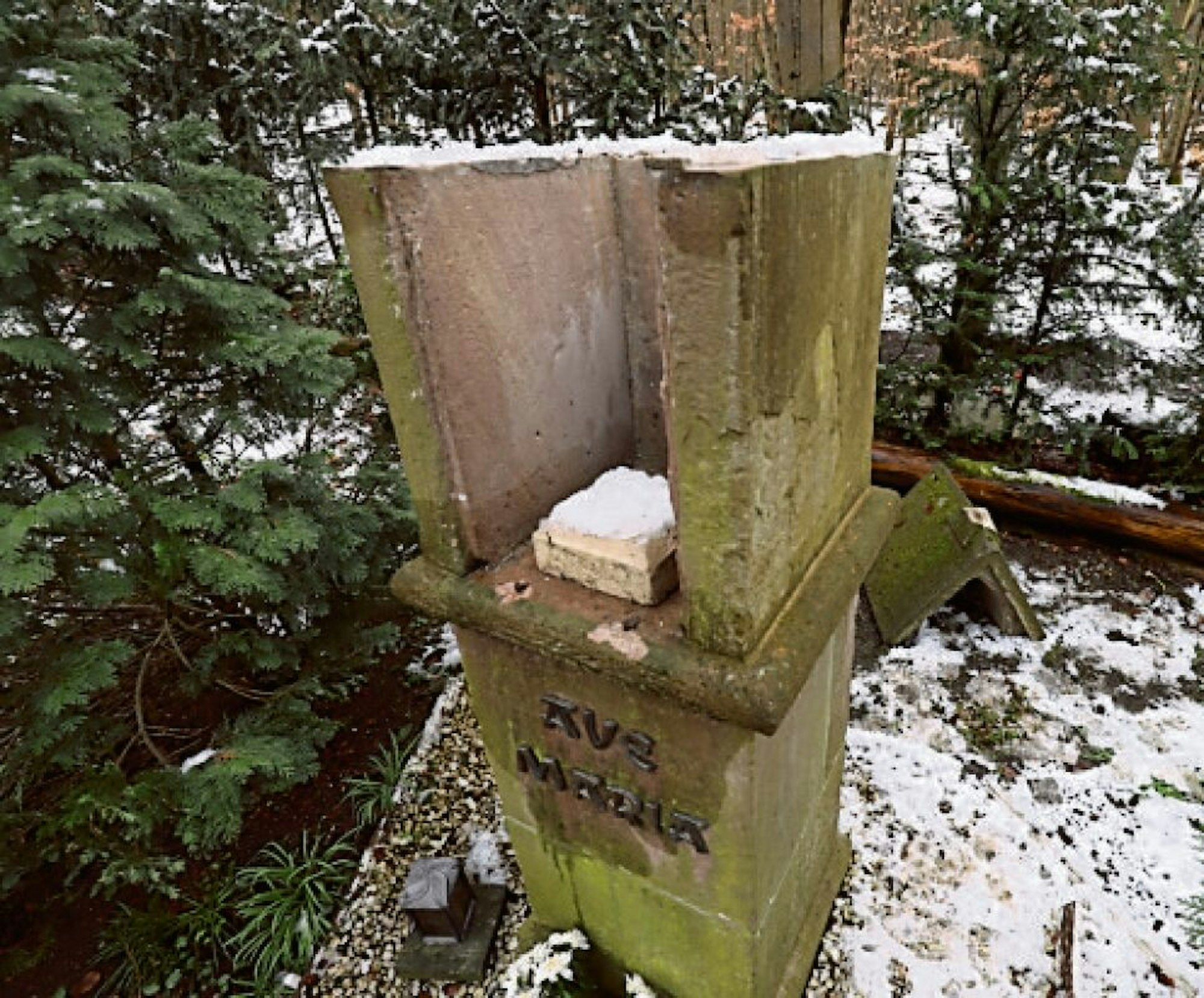 „Die Pieta ist aus Keramik und rund 40 Jahre alt“, so Nowak. Angefertigt worden sei die kleine Skulptur von einer Schwester aus Füssenich im Auftrag der Abtei. Der Bildstock selbst ist jedoch deutlich älter. Mehr als 50 Jahre hat Bruder Sebaldus die kleine Anlage gepflegt und sich auch darum gekümmert, dass die Schrift wieder angebracht wurde. Täglich sei er dort oben im Wald gewesen. Zweimal, so Bruder Sebaldus, hätten die Mariawalder Mönche den Bildstock restaurieren lassen, als der Zahn der Zeit am Sandstein genagt habe.