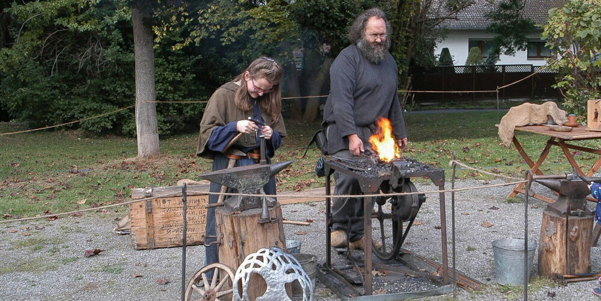 Schürte kräftig sein Schmiedefeuer: Martin Schüller mit seiner Tochter Morgaine, die eine Spange anfertigte.