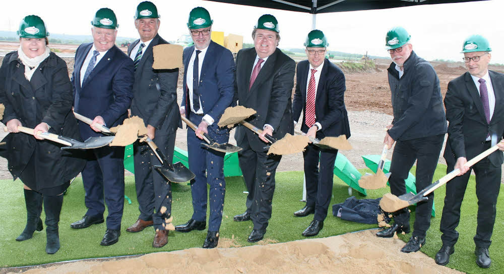 Die Herren und eine Dame – NRW-Landwirtschaftsministerin Ursula Heinen-Esser – hatten es mit dem symbolischen ersten Spatenstich eilig: Es regnete in Strömen – was bei den anschließenden Grußworten im Zelt als gutes Omen gesehen wurde. „Kühe brauchen Wasser“, so Landrat Günter Rosenke zu denjenigen, die für das, was hinter den „Spatenstechern“ jetzt entstehen soll, schließlich den Grundstoff liefern werden: Milch für eine Molkerei.