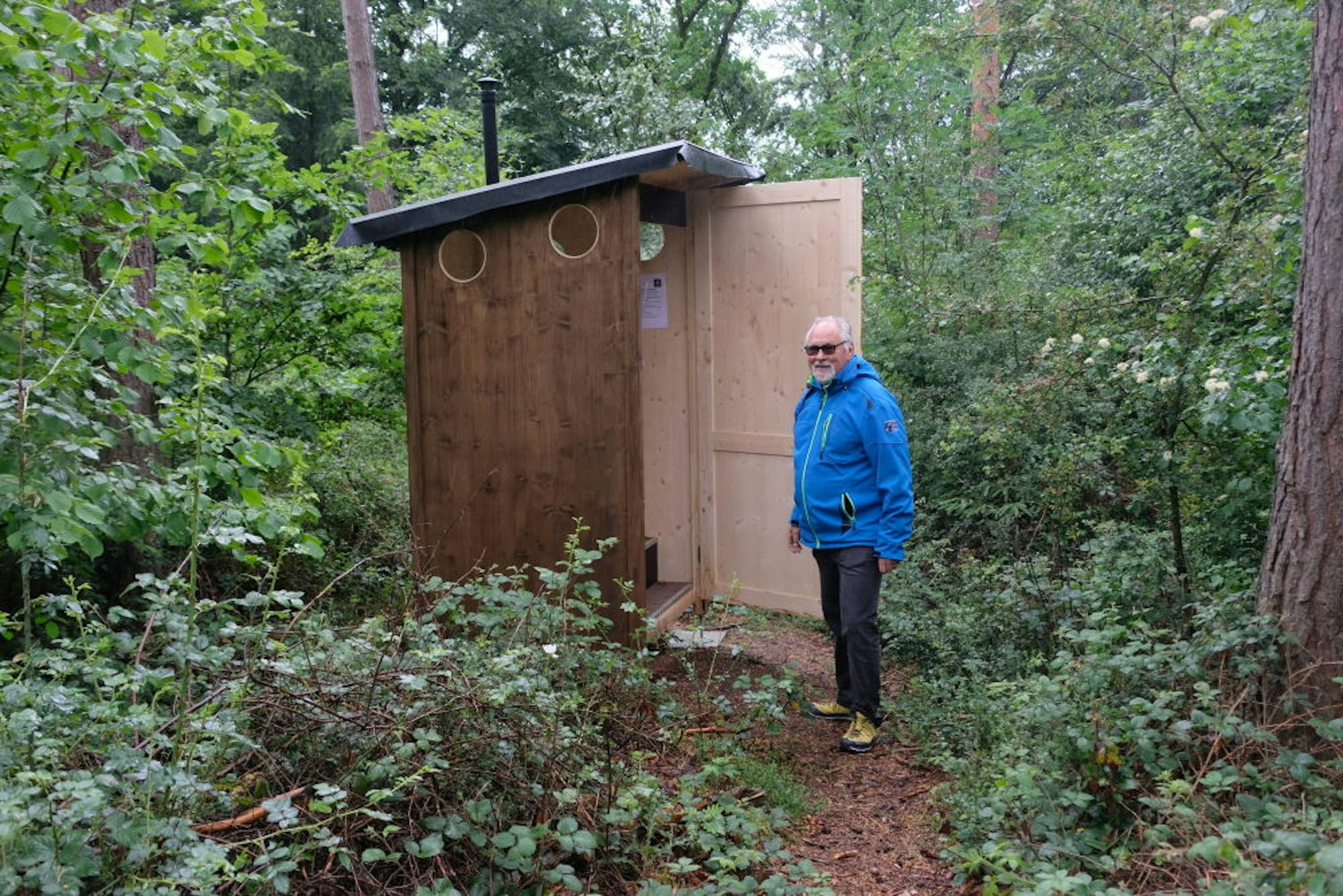 Eine Biotoilette ist im Gebüsch am Naturlagerplatz versteckt.