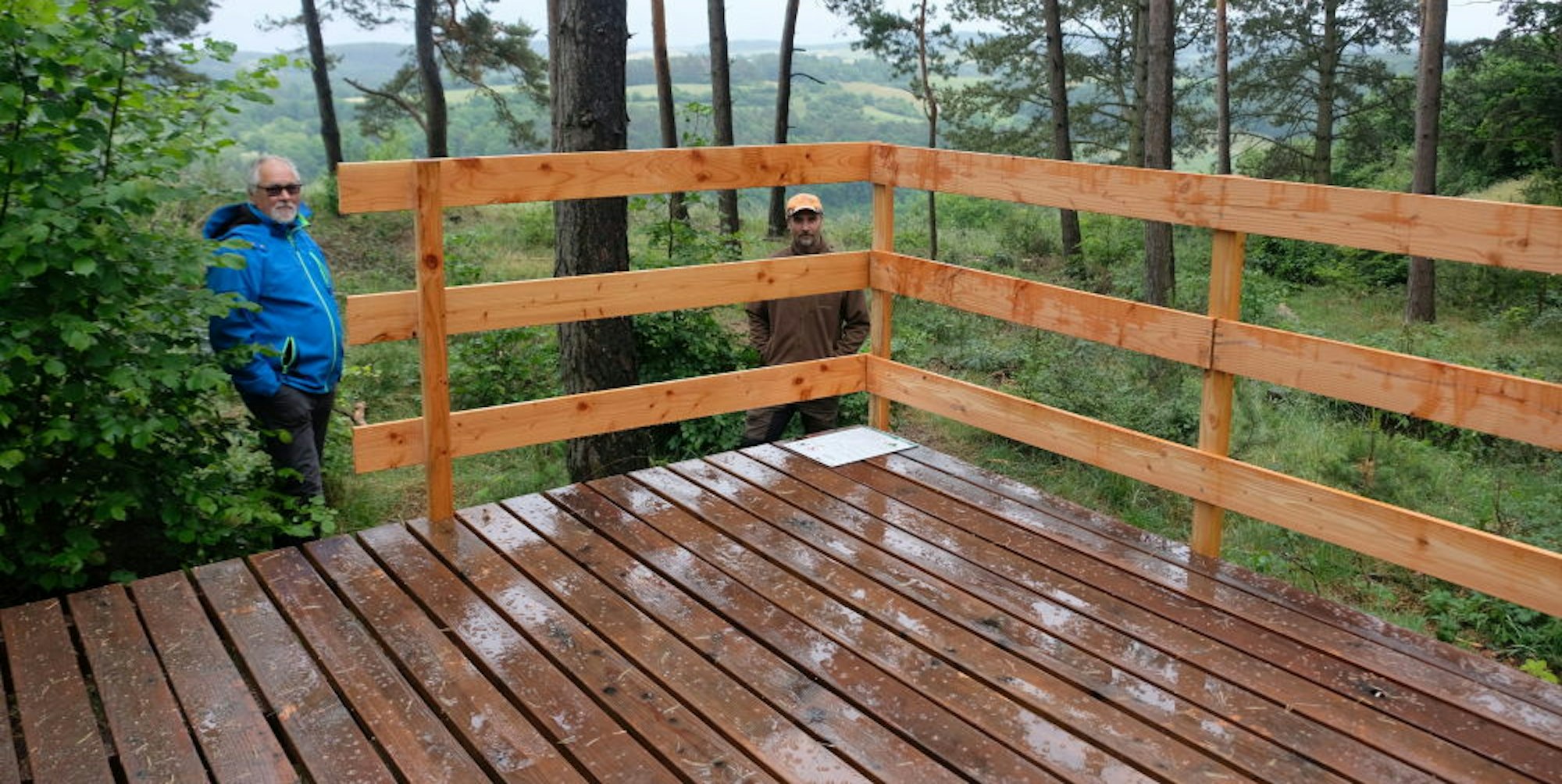 Der Kallmuther Ortsvorsteher Robert Ohlerth (l.) und Johannes Trimborn vom Ortskartell wollen die Trekkingplattform am Waldrand oberhalb von Vollem auf jeden Fall behalten.