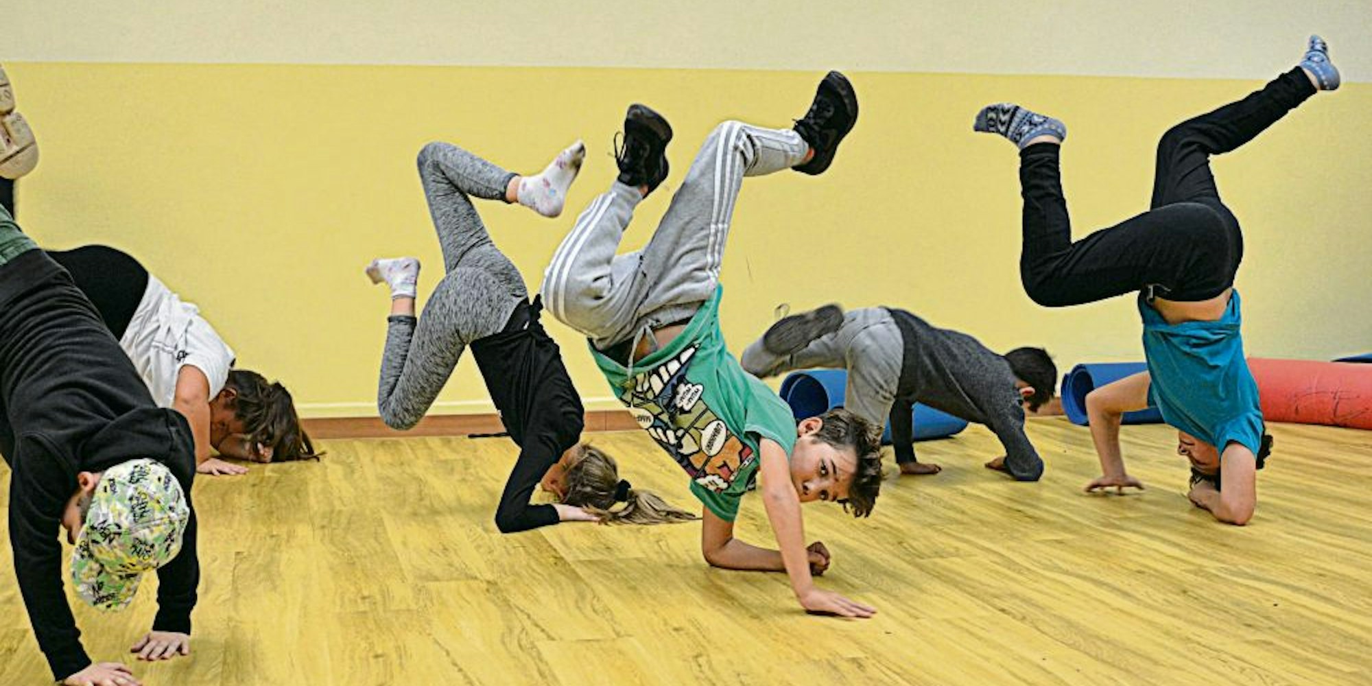 Freuen sich über das Angebot des Kinderschutzbundes: Brayan (2.v.l.) und die anderen Kinder zeigen beim Tanzkurs in der Mechernicher K.O.T den Schulterstand.
