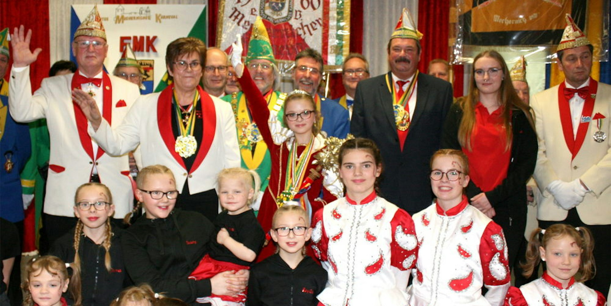 Mitten drin im jecken Treiben: Jugendprinzessin Pauline I. mit den Vereinsvorsitzenden und Präsidenten des Mechernicher Karnevals bei der Proklamation.