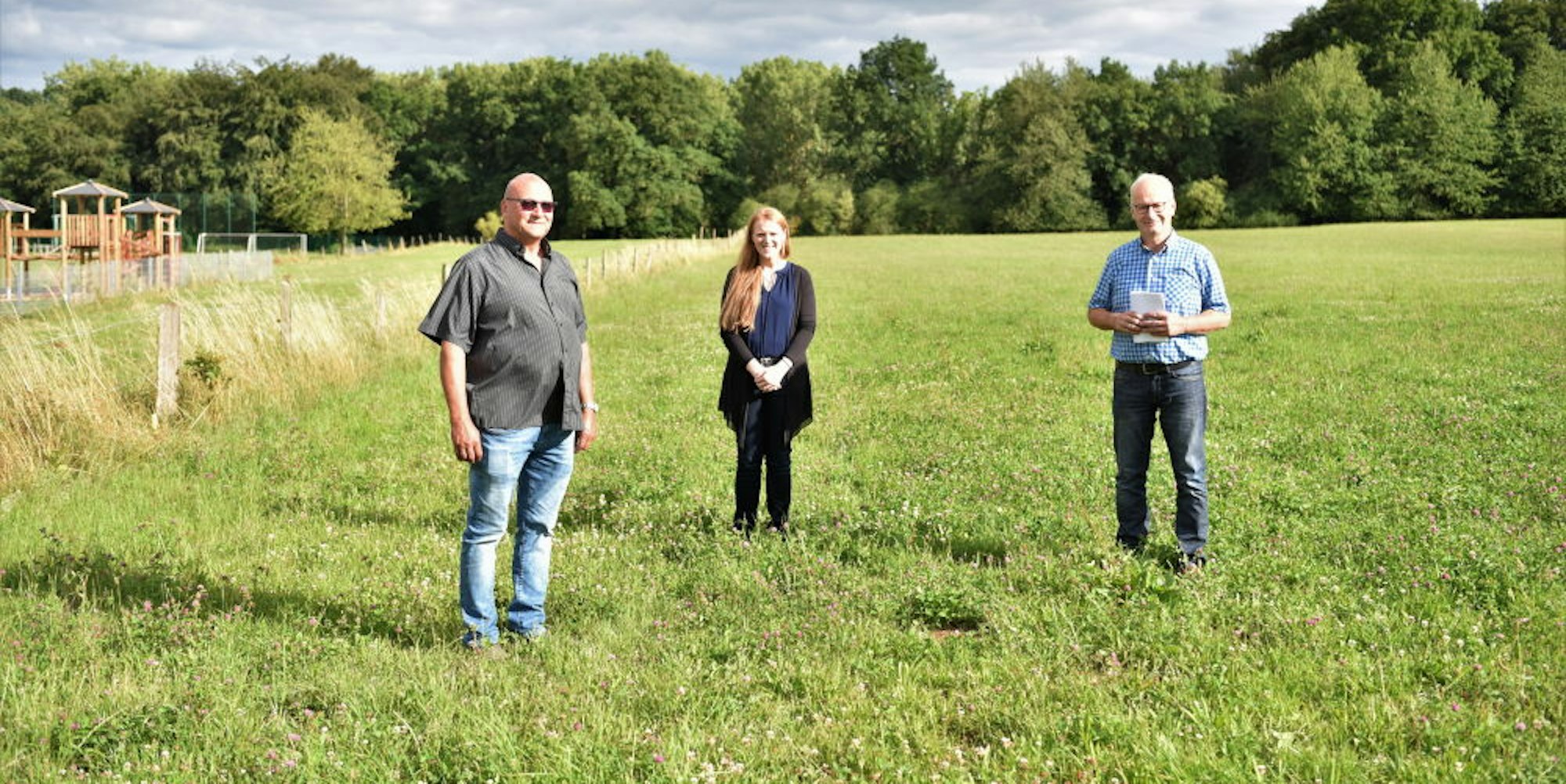 Hier soll das neue Dorfgemeinschaftshaus gebaut werden: Ortsvorsteher Karl-Heinz Seeliger (v.l.), Birgit Braun-Näger und Bürgermeister Dr. Hans-Peter Schick begutachten die Wiese hinter dem Sportplatz.