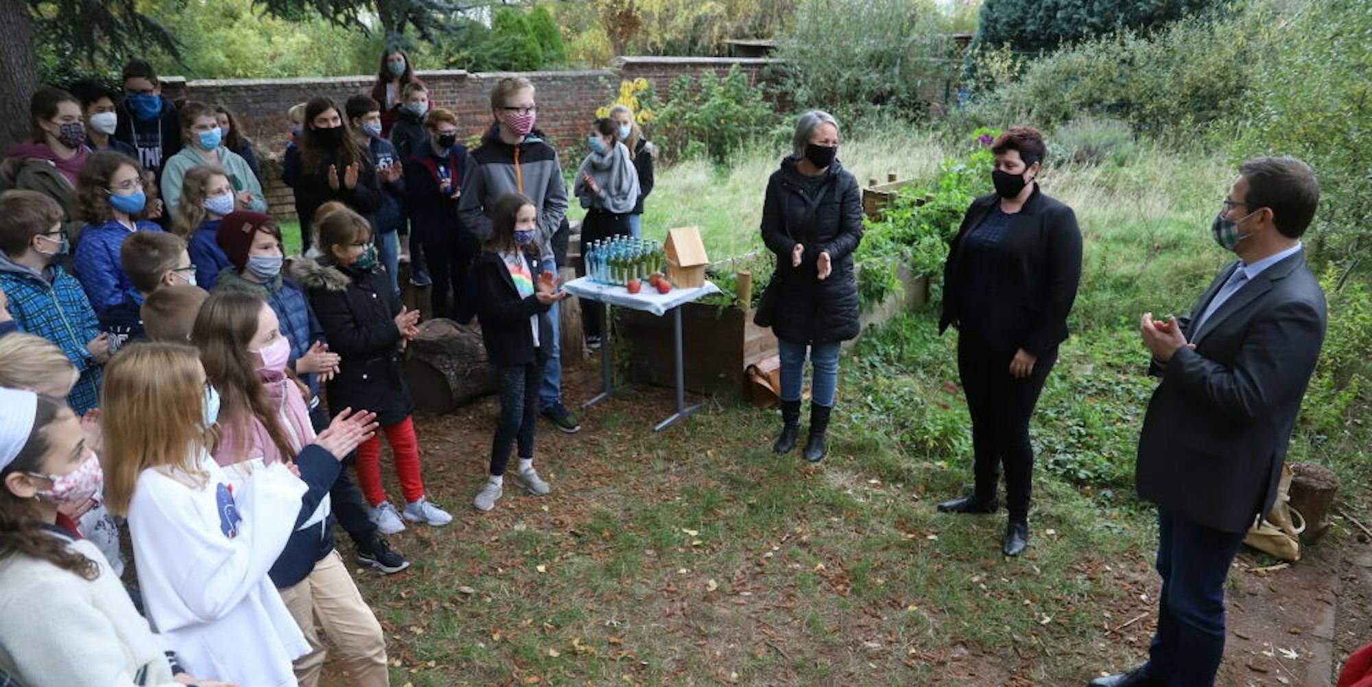 Die Mitglieder der Naturgarten-AG des GAT freuten sich mit den Pädagogen über die Auszeichnung.