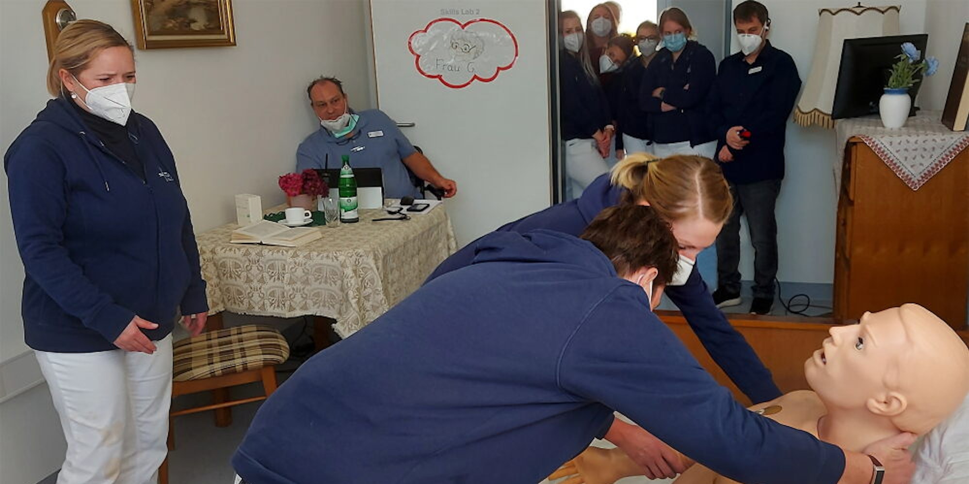 Der „Patient“ klagt über Atemnot. Die Studierenden des Bachelor-Studiengangs „Pflegeexpertise“ müssen schnell entscheiden: Können sie ihn vor Ort behandeln oder muss er ins Krankenhaus?