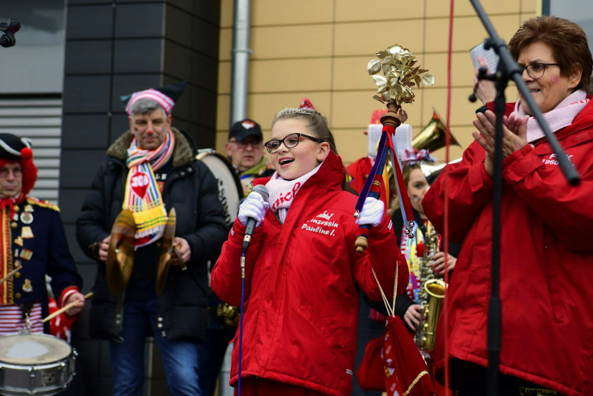Friedlich und kampflos wollte das Stadtoberhaupt die Herrschaft natürlich trotzdem nicht den Narren überlassen, die sich unten vor dem Eingang des mit bunten Luftballons aufgemotzten Verwaltungsgebäudes seit kurz vor 11 Uhr schonmal warmfeierten. Schunkelnd und singend erwarteten die Mechernicher die Ankunft ihrer jecken Regentin, Jugendprinzessin Pauline I. (Gerhards).