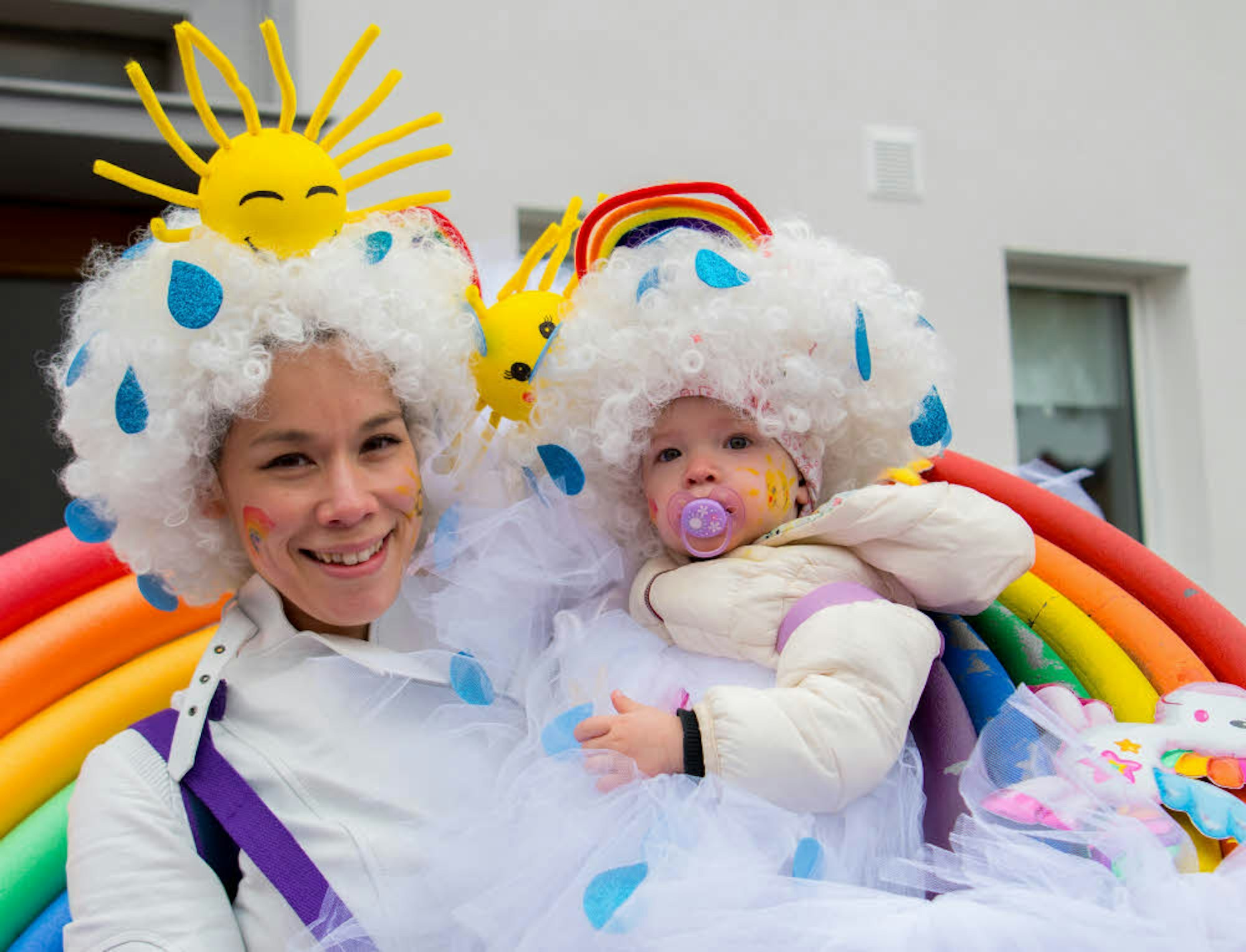 Erst Teilnehmer des Kinderzugs, nun als Besucher am Zugrand, trug dieses Mutter-Tochter-Gespann das passende Kostüm zum Wetter.