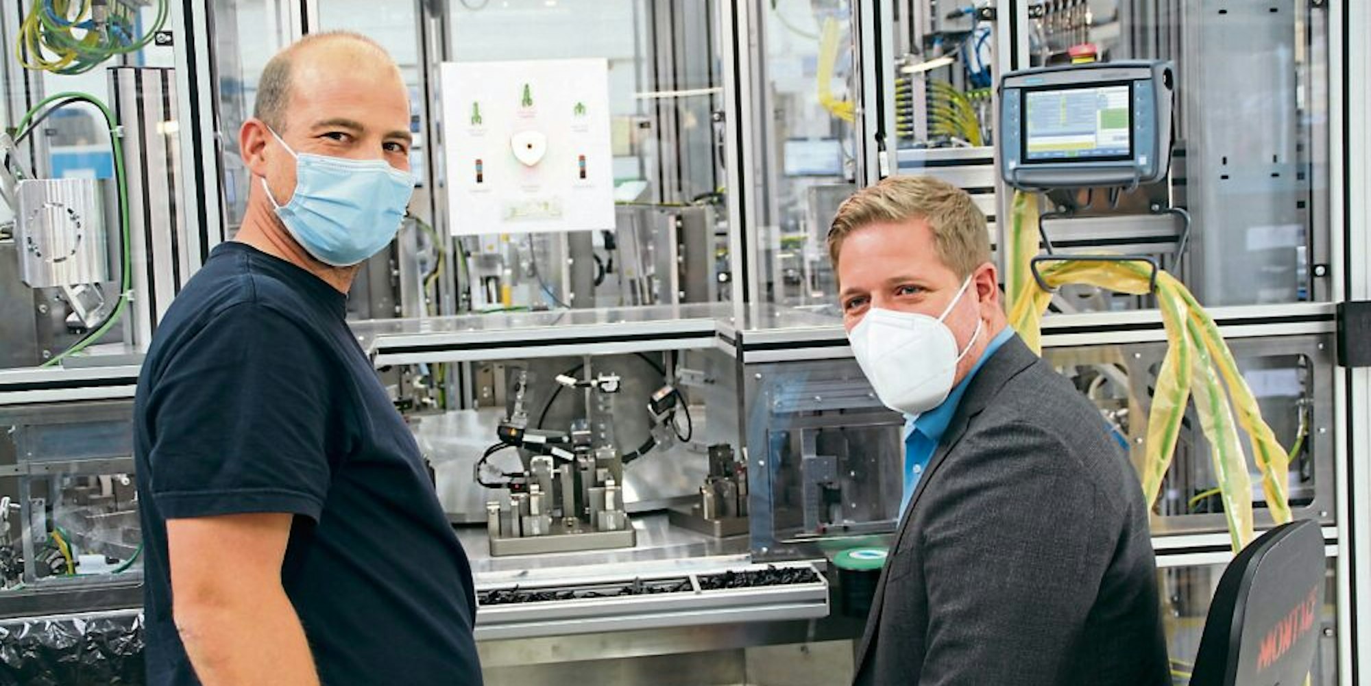 Eine neue Maschine ausprobiert: Schichtführer Stefan Wiskirchen erklärt Landrat Markus Ramers die Arbeitsschritte.
