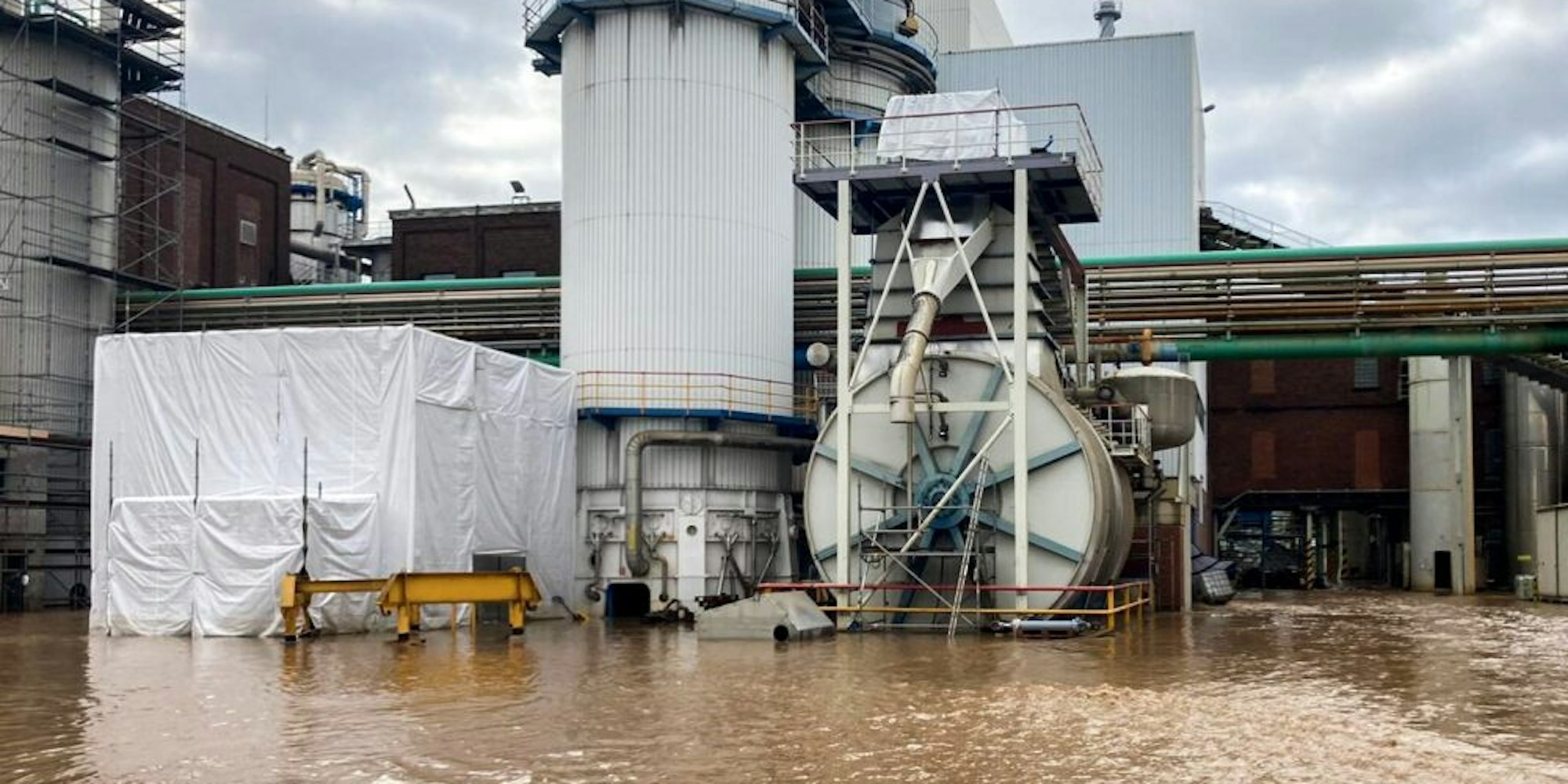 Normalerweise fließt die Erft hinter dem Werk an der Alfred-Nobel-Straße vorbei. In der Nacht auf den 15. Juli schwappte sie mitten durch die Fabrik. Als der vorher durch die Fluten aufgestaute Damm aus Schutt und Bäumen brach, stand das gesamte Betriebsgelände unter Wasser – teilweise bis zu eineinhalb Metern. „Die Keller sind genauso vollgelaufen wie die Werkstatt. Die Waage stand unter Wasser. Einfach alles“, berichtet die Pressesprecherin. Weil die Wassermassen in der Nacht kamen, waren die Maschinen nicht am Netz – Glück im Unglück. „Das wäre wohl ein Totalschaden geworden“, sagt Schumacher.