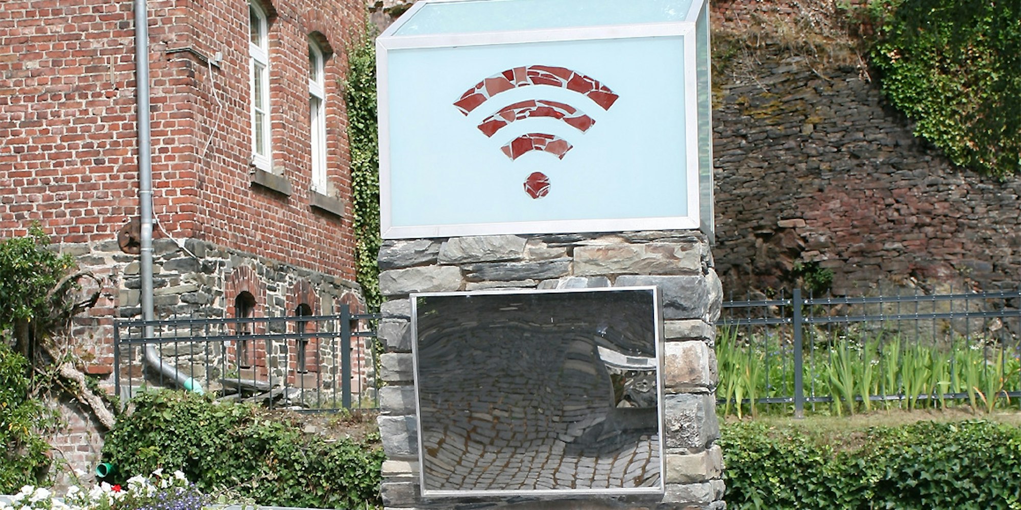 Die Besucher sind eingeladen, auf einem überdimensionierten Thron aus Grauwacke Platz zu nehmen. Die Lehnen aus Schiefer waren einst Treppenplatten in der Altstadt. Über diesem seltsamen Sitz ist erst ein konkav gewölbter Spiegel aus Scherben installiert. Und dann ist ganz oben das bekannte WLAN-Logo zu sehen, das bei Dunkelheit beleuchtet ist. Um was mag es sich handeln? Ist es nur ein weiterer, etwas seltsamer Hotspot für das kostenlose Internetangebot der Stadt Monschau?