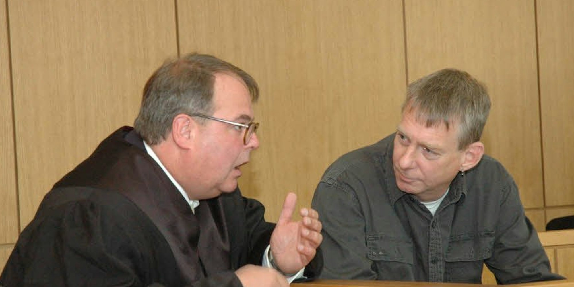 Ralf Schiesberg, hier im Gespräch mit Verteidiger Albert Stumm, wurde wegen Mordes zu lebenslanger Haft verurteilt.