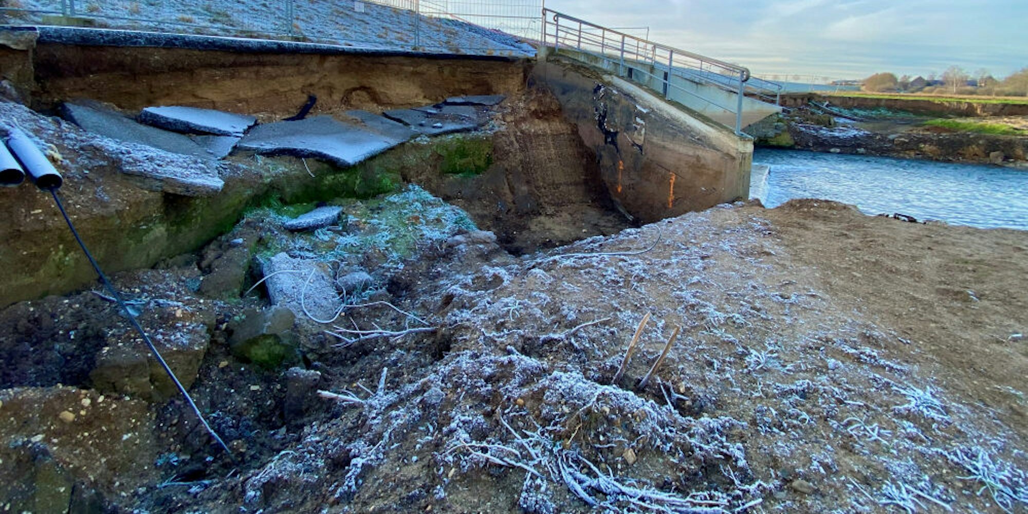 Die Rückseite des Horchheimer Damms, vor allem die Steuerwarte, ist stark zerstört. Die Schäden an der Rückseite des Dammes wurden provisorisch behoben.