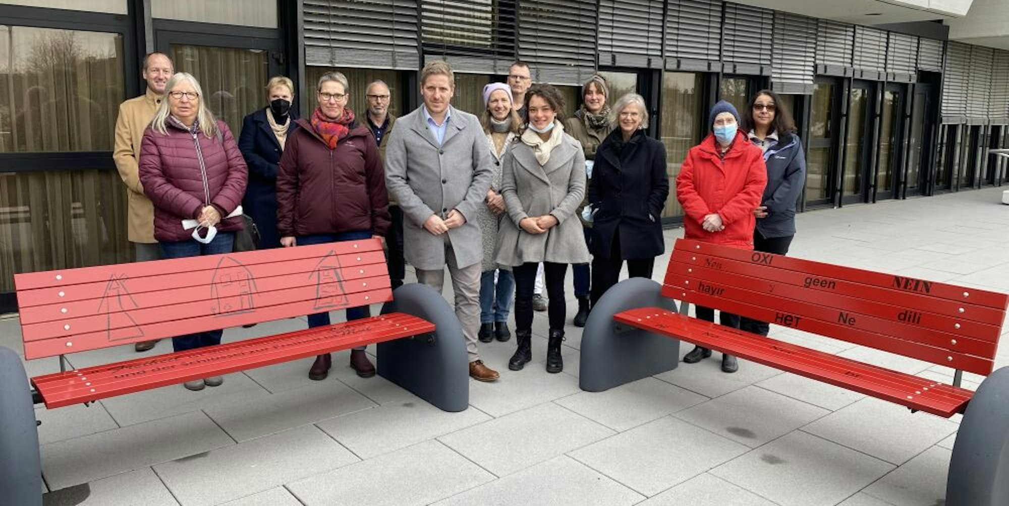 Nein in 16 SprachenRote Bänke machen in Euskirchen auf Gewalt an Frauen aufmerksam