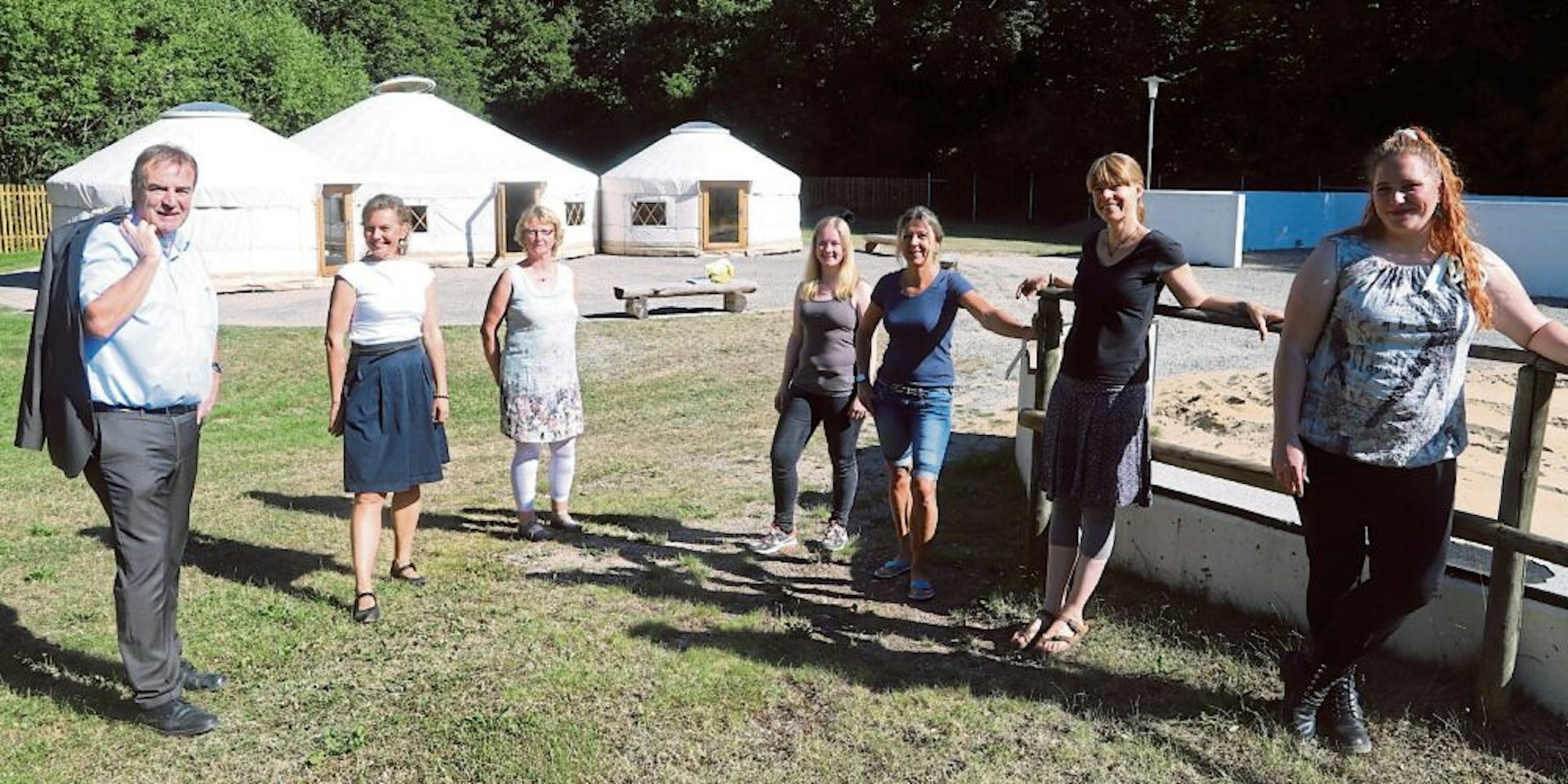 Auch wenn noch einiges zu tun ist auf dem Gelände am Ortsrand in Richtung Rosenthal, so ist der reguläre Betrieb gewährleistet. Mit einem stabilen Holzzaun ist das lockende Ufer der nahen Urft versperrt, und die Gebäude des Jugendzeltplatzes sind mit Sanitäreinrichtungen versehen worden. Blickfang ist die große Jurte, die extra für den Waldkindergarten errichtet wurde.