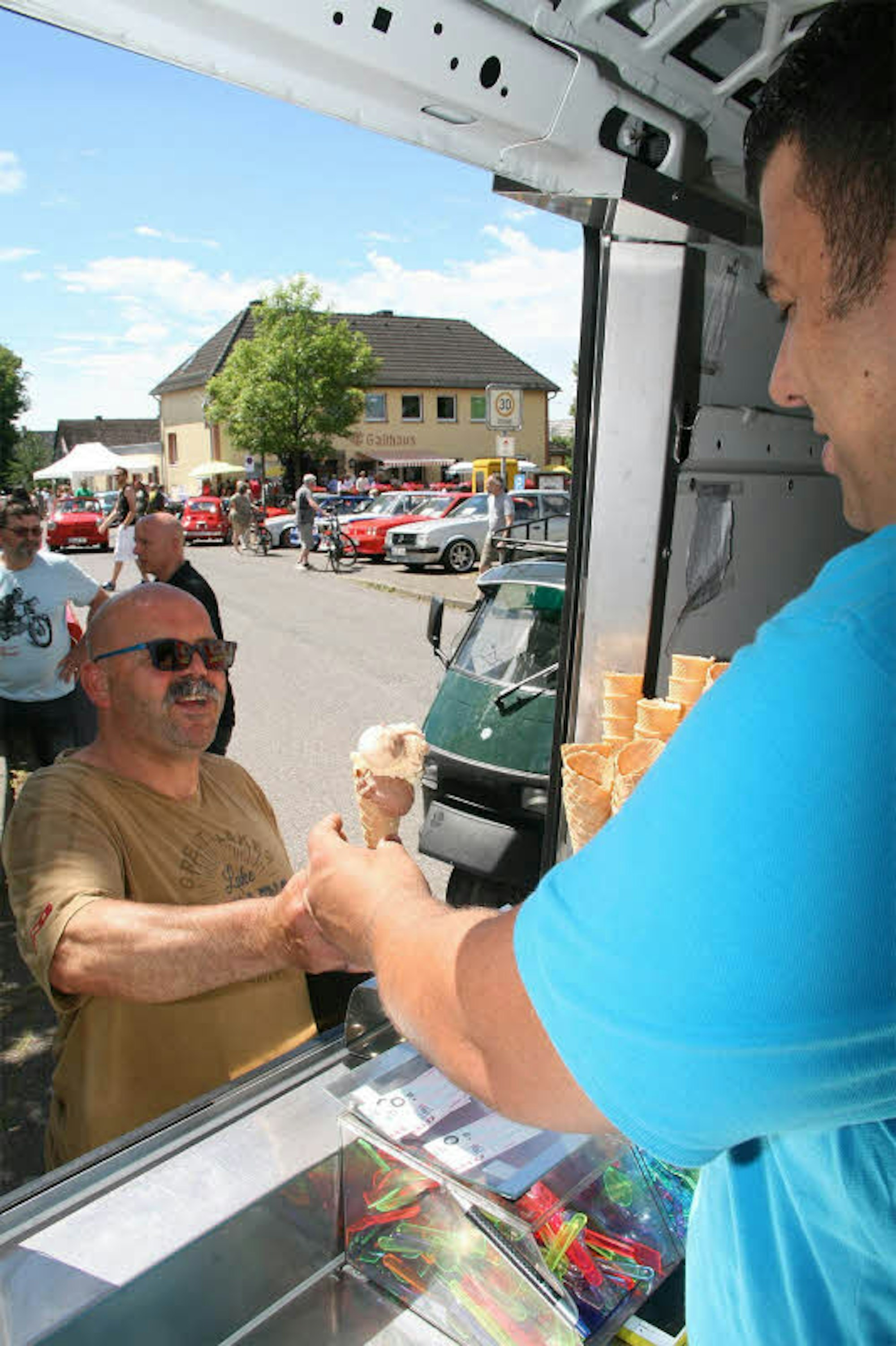 Nicht nur die Schätzchen auf vier Rädern waren die Stars in Zingsheim. Belagert wurde auch die mobile Eisdiele „Taormina“, mit der Francesco aus Rheinbach gekommen war. „Vanille, Mocca, Stracciatella, Nuss – wie immer!“ Kugel um Kugel verkaufte er in Waffel oder Becher. Logisch: Bei schönstem Sommerwetter war die Nachfrage nach Gekühltem groß.