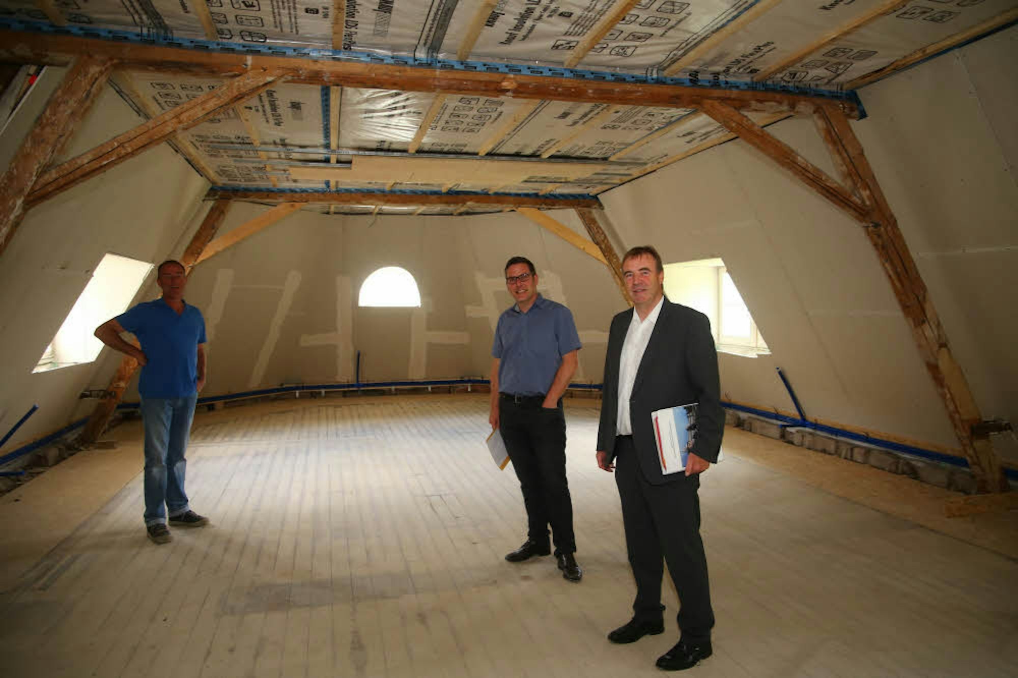 Den Gruppenraum im Dachgeschoss begutachten Bürgermeister Wilfried Pracht (v.r.), Norbert Crump und Bauleiter Dieter Schruff.