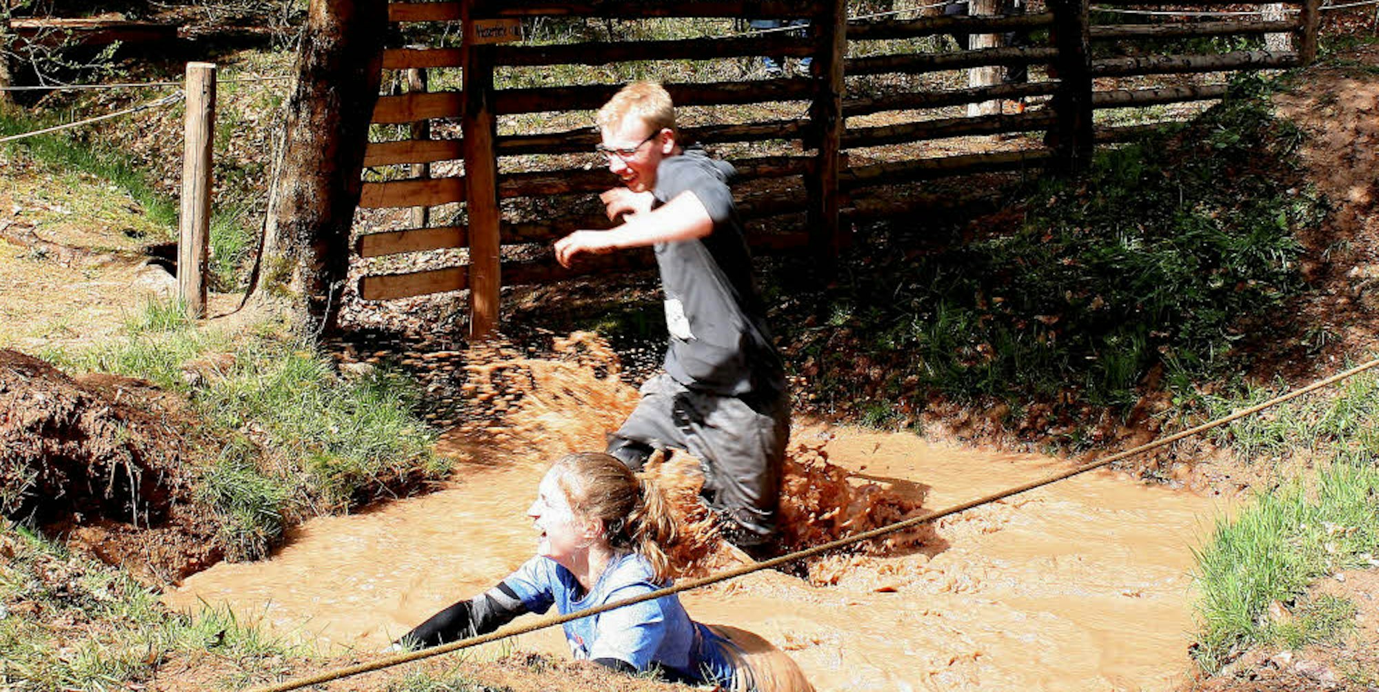 Überwindung gehört dazu: Ein Team nach dem beherzten Sprung in die Schlammkuhle, die einen Meter hoch mit Wasser gefüllt ist.
