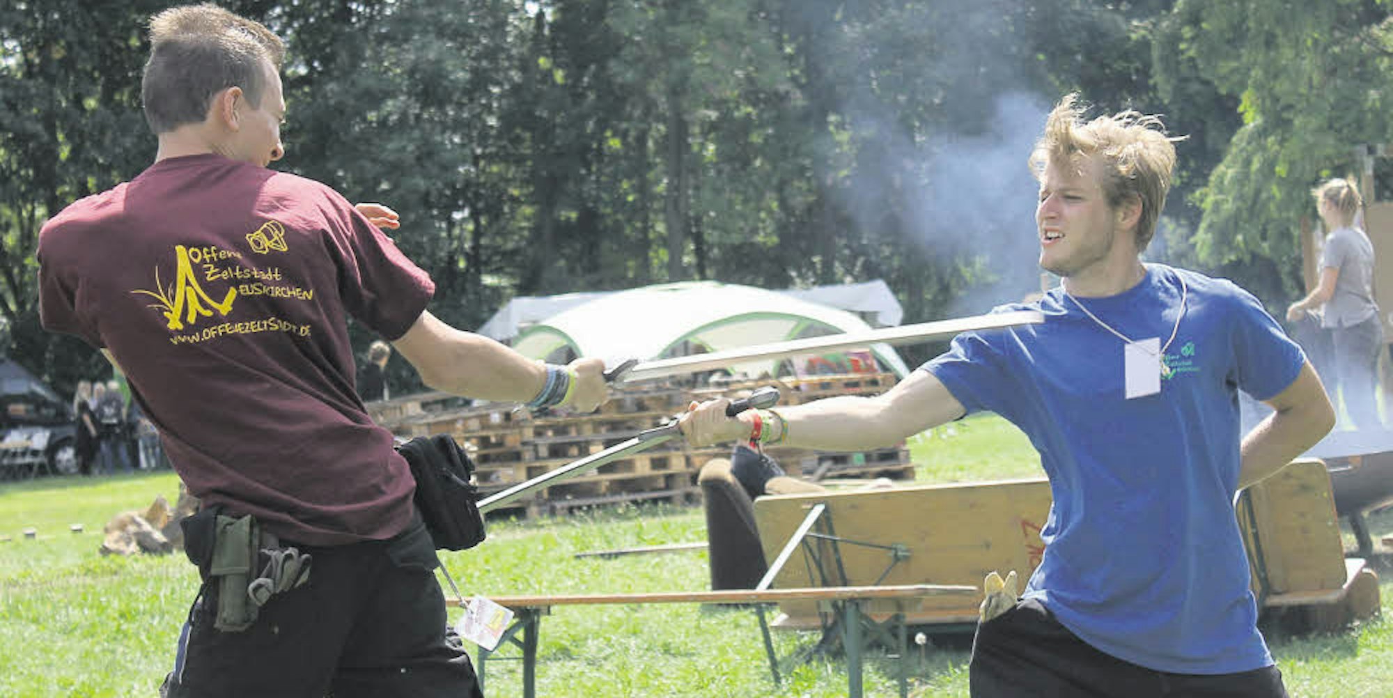Euskirchen – „Wir kämpfen gegeneinander und spielen miteinander“, berichtet Stefan Vollmer. Auf dem Gelände der Offenen Zeltstadt bringt der 21-Jährige den Camp-Teilnehmern den Larp-Schwertkampf näher (siehe auch „Was bedeutet Larp?“). „Eigentlich ist der Kampf wie ein Rollenspiel mit Verkleiden. Wir spielen aber eine abgespeckte Version“, so der Student aus Euskirchen.