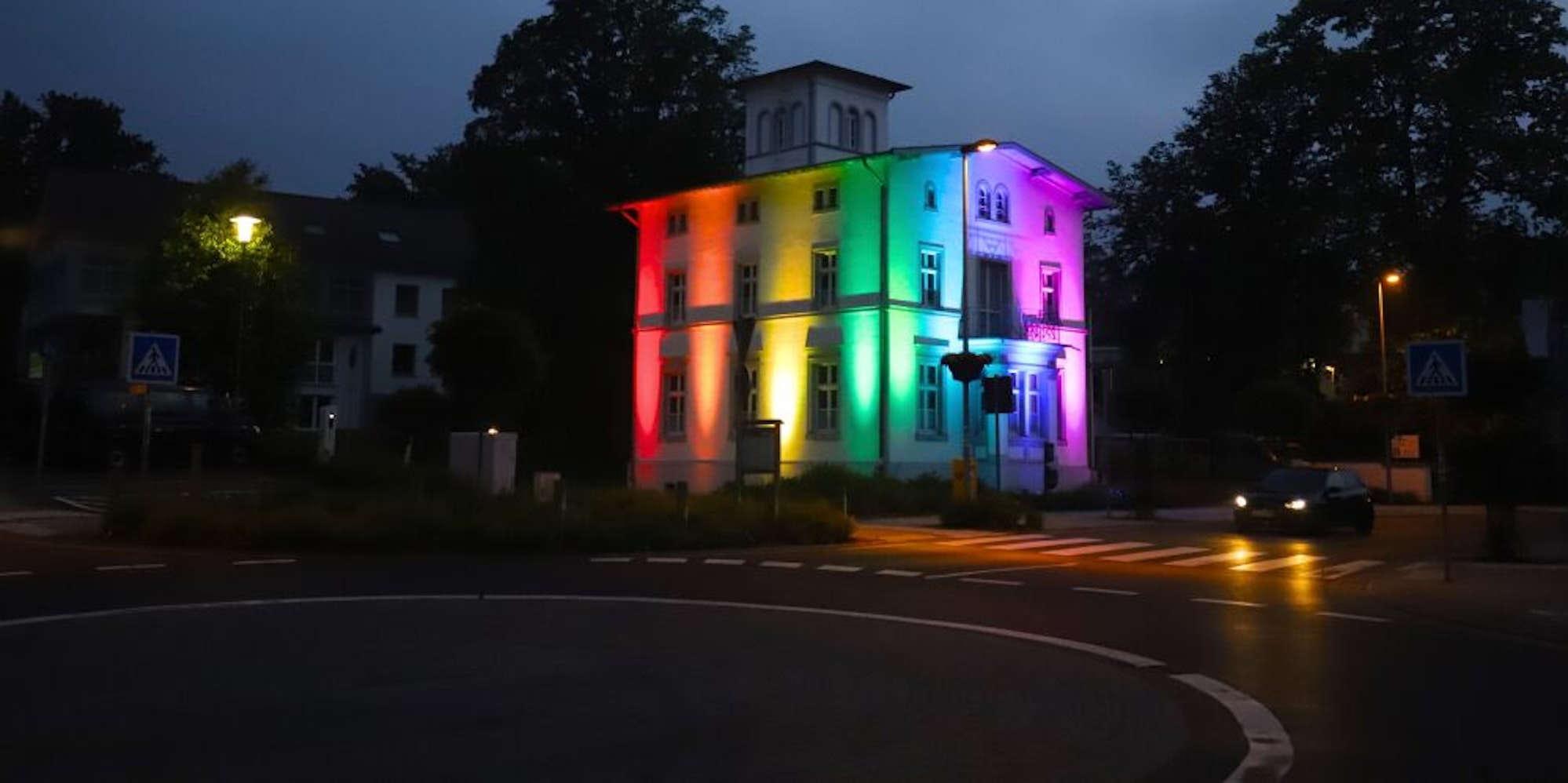 Noch war die Halbzeitpause im EM-Spiel Ungarn gegen Deutschland nicht zu Ende, noch führte Ungarn mit 1:0 Toren, was das EM-Aus der deutschen Mannschaft bedeutet hätte, da erstrahlte in Hellenthal ein Licht der Hoffnung und der Zuversicht. In den Farben des Regenbogens, die Farben der Fahne der LGBTQ-Bewegung (Lesbisch, Schwul, Bisexuell, Transgender, Queer), wurde das Weiße Haus, das Nebengebäude des Hellenthaler Rathauses, angestrahlt – als Zeichen für Solidarität und Toleranz aus der Eifel, so die Initiatoren.