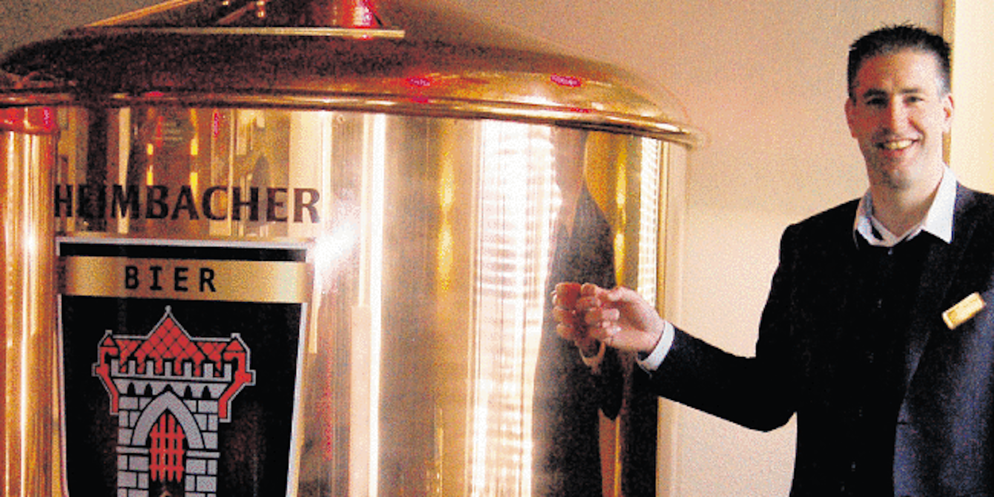 Den Kessel mit dem Heimbacher Stadtwappen kann Serge van der Heijden derzeit nur als Deko präsentieren. Heimbacher Bier ist im Resort-Brauhaus aber dennoch im Ausschank. (Foto: Scheurer)