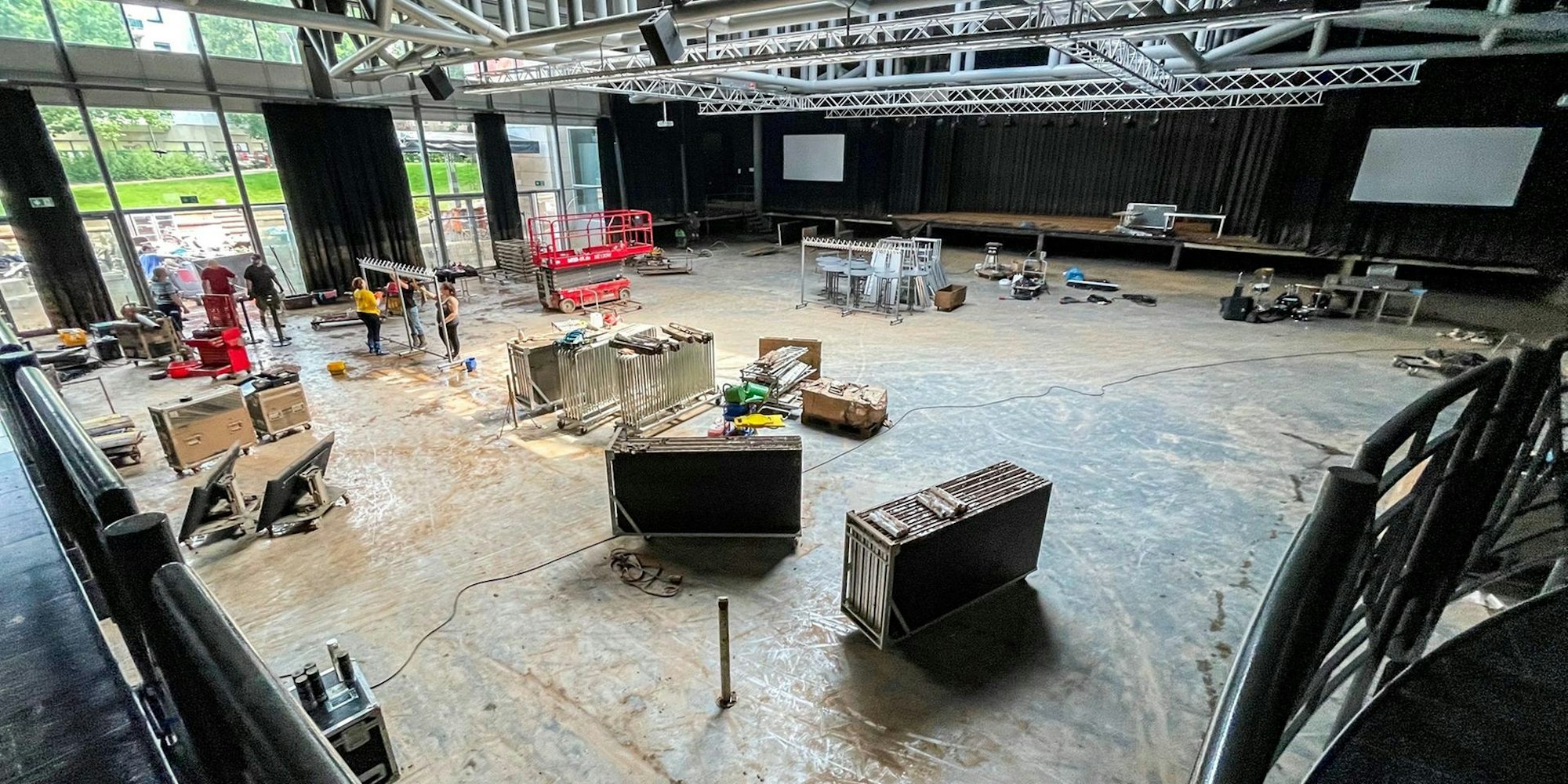 Zurück ins City-Forum: Dort haben die Wassermassen laut Huthmacher nicht nur 1200 Stühle und Hunderte Tische unbrauchbar gemacht, sondern auch die für viel Geld neu installierte Akustik und Technik. Was in den vergangenen Jahren nicht angepackt worden ist, nun aber erneuert werden muss: die Lüftungsanlage. Dies sei ein Punkt, der sicherlich entsprechende Kosten verursachen werde, weil sie sich durchs ganze Gebäude ziehe.