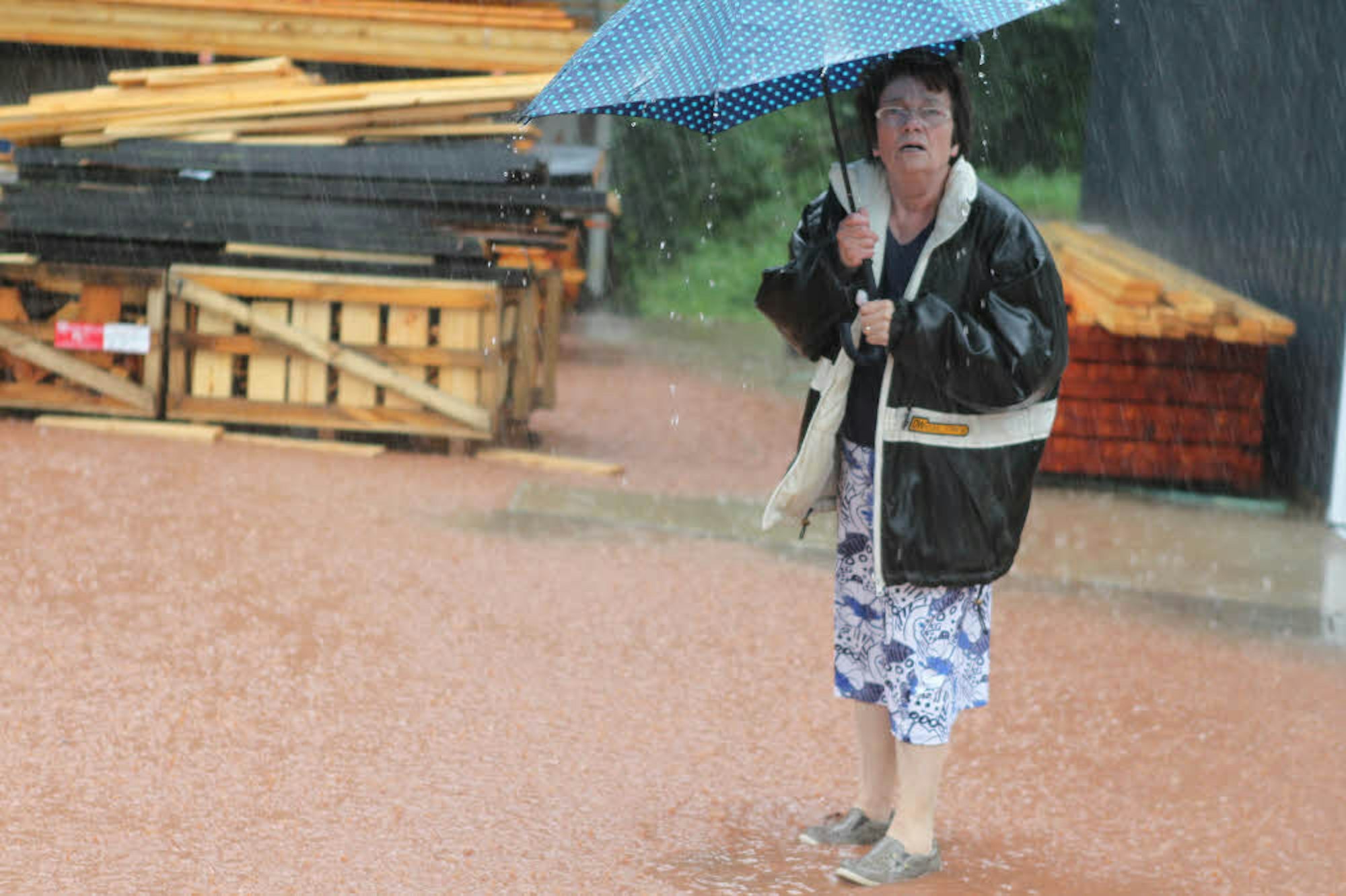 Renate Leyendecker hat sich am Freitagmorgen erst einmal neue Gummistiefel gekauft. „Ich hatte bisher keine. Die waren auch nicht nötig“, sagte die 66-Jährige. Diese Meinung hat sie am Donnerstag, als der Sturzregen niederging, grundlegend geändert. Ihre Zimmerei liegt zwischen den beiden neuen Kreiseln zwischen Roggendorf und Strempt. Die Lage unterhalb der dort verlaufenden Kreisstraße wurde der Zimmerei zum Verhängnis.