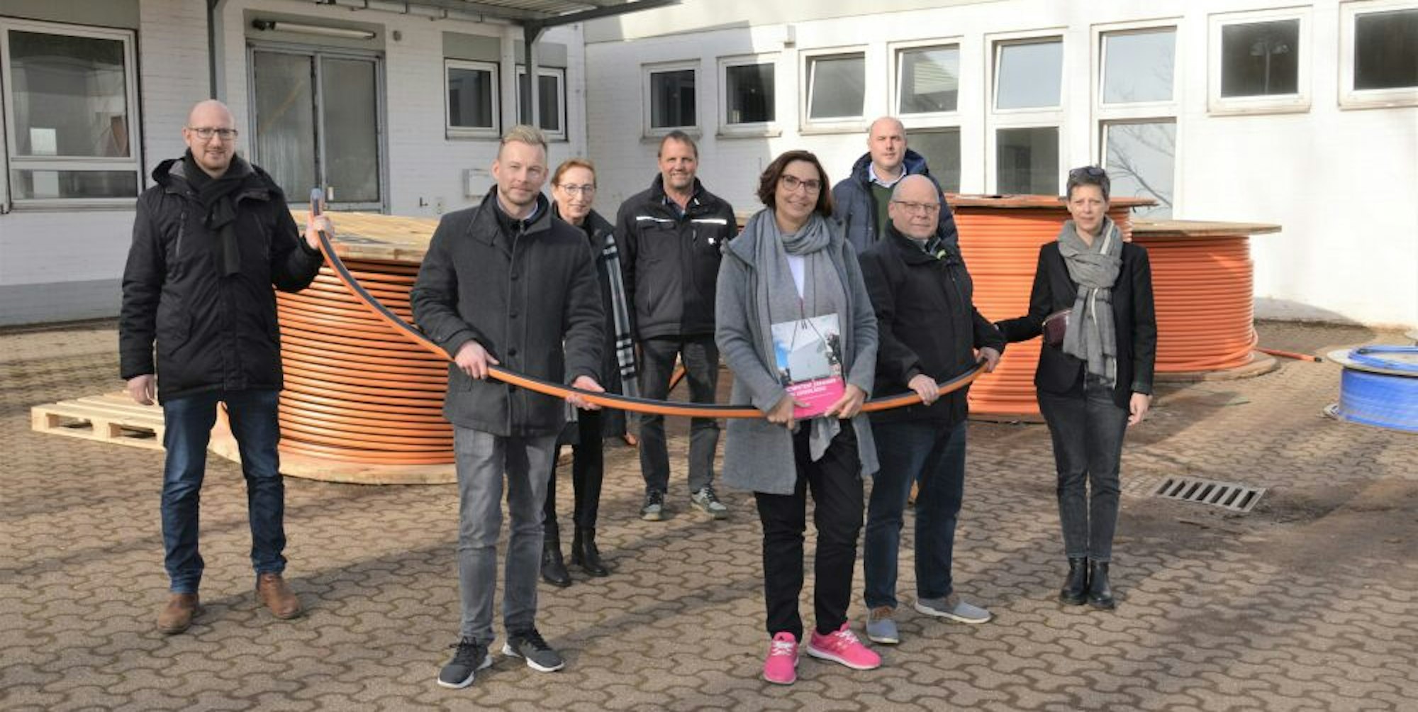 Die Leerrohre liegen bereit: Über den Ausbau des Glasfasernetzes informierten Gerd Wolter (2.v.r.) von der Telekom und seine Kollegen und Kolleginnen im Beisein von Schleidens Bürgermeister Ingo Pfennings (l.) und Wirtschaftsförderin Bianka Renn (r.).