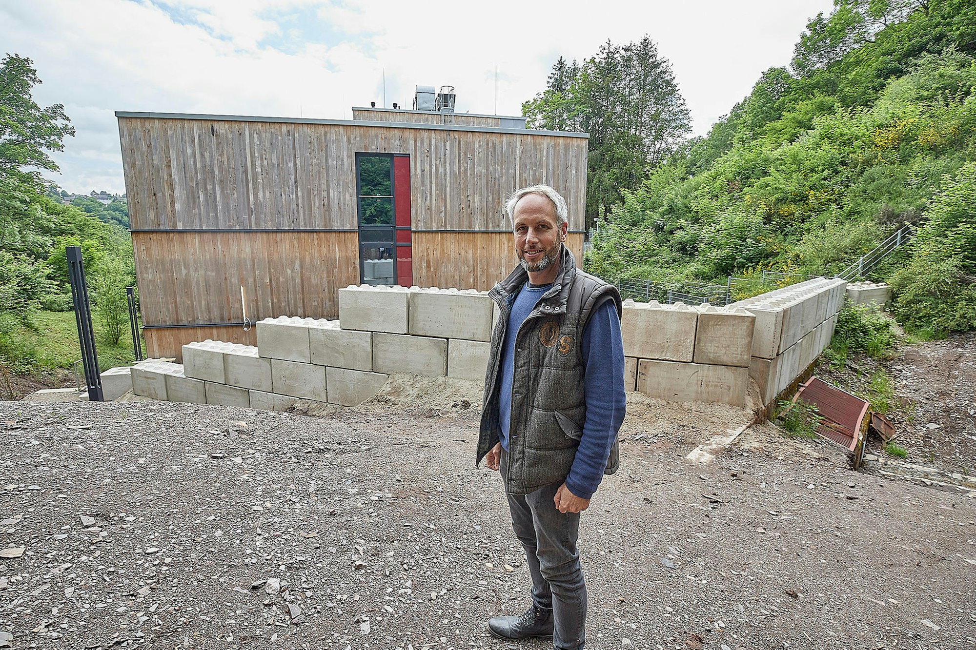 Herbergsvater Jascha Rasky vor der Flutmauer, die die Stadt Schleiden zum Schutz vor Wasser mittlerweile errichtet hat.